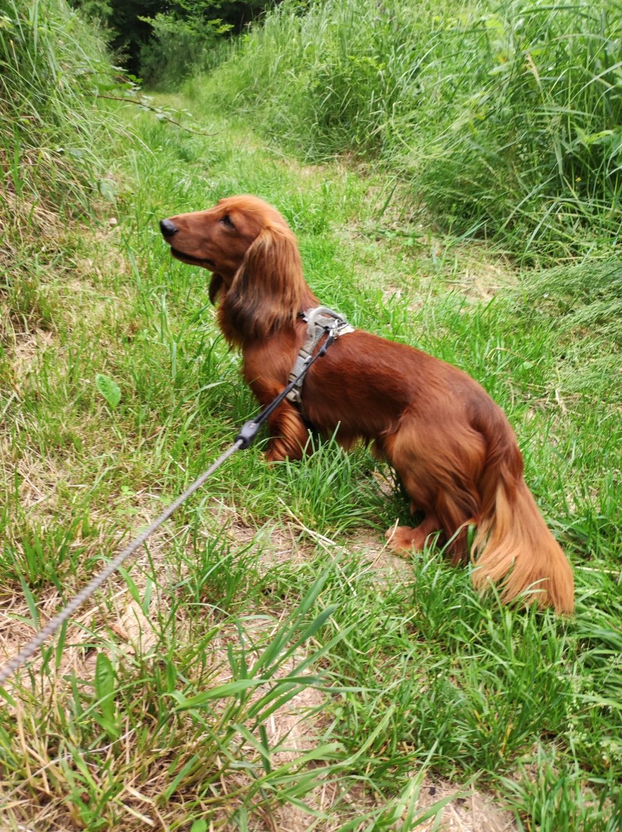Mirďa smí do lesa, hurá hurá hurá. Sice zatím jen na vodítku, ale krásně posiluje záda, jak je vysoká tráva a on větří s nosem nahoře. Ale fotit se nebude prej ani za modrý z nebe 😀. Dneska jsme cvičili už 2x, je moc šikovnej. Snad si pamatuju všechny ty cviky. Teď leží na magnetu.