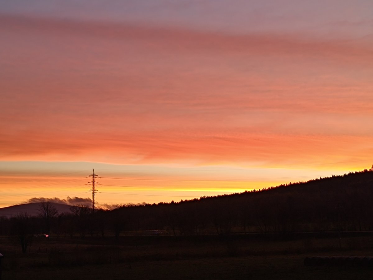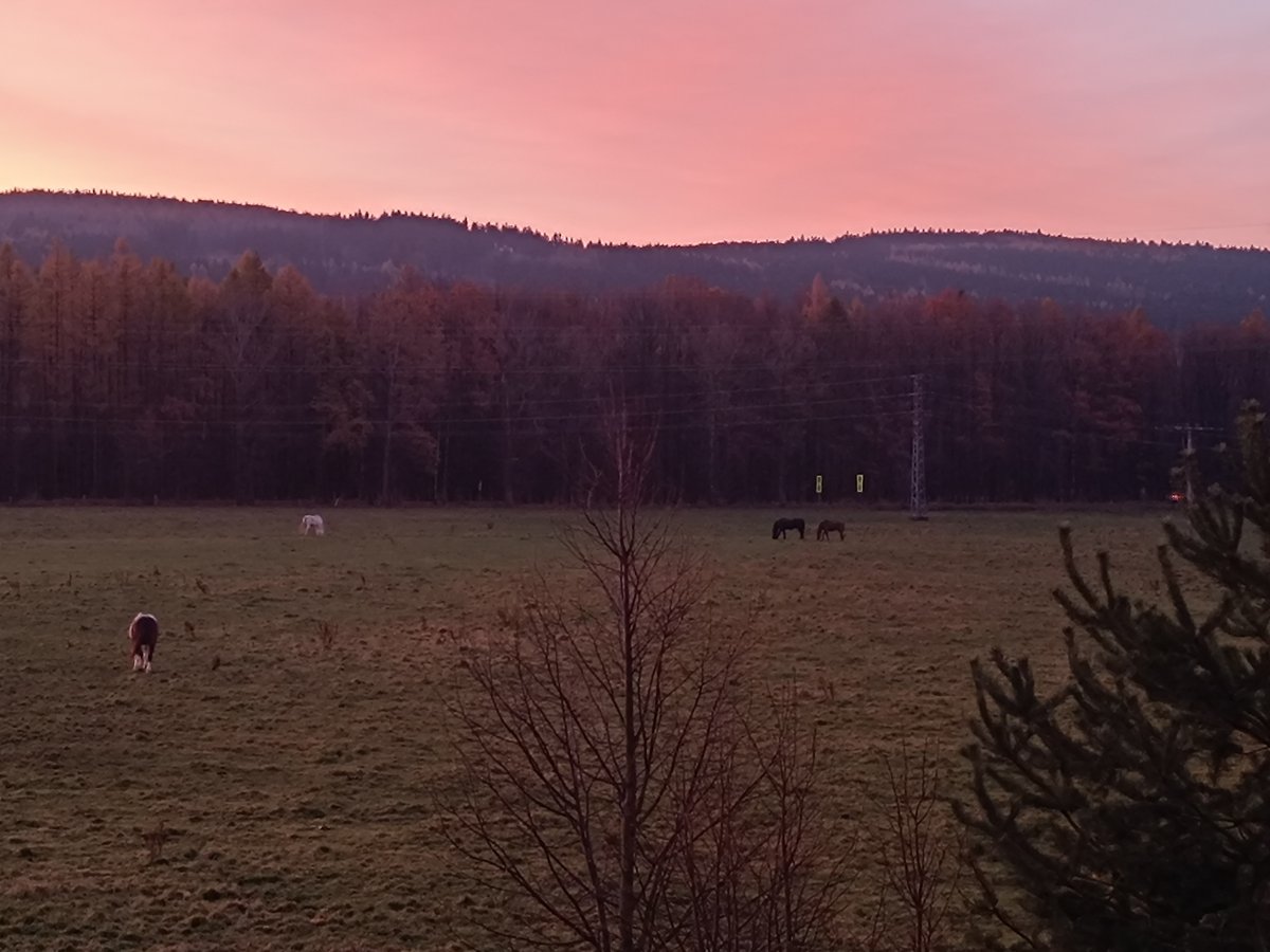 Hezký den přeji, východ se dnes opět poved (hora Smrk vlevo), tak ať se povede i celý den. U mě nehrozí, u mne trvá “prokletí vyhozené koňarky z pozemku” 😁 , tak se ne úplně daří, ale třeba bude pohoda, jak u koní na pastvině 🤞a stavba se zase trochu hne. Ať se vám daří.