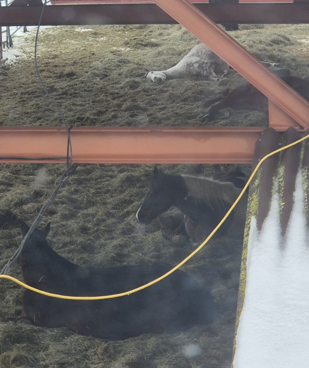 Škoda, že to nejde vyfotit lépe. Šest vymrtvenejch koní v hale, chudáci utejraný. To počasí davá jak mně tak těm zvířatům. Jeden den -16, druhej den +2… Škoda. Co už, mame demokracii. Většina si přeje vystoupit z klasického střídání ročních období, mrazy a sníh jsou největší nepřítel, a když se mi to nelíbí, tak se mám jít bodnout a odstěhovat do Alp, prej. Jo jo, demokracie, to je taky pěkný svinstvo.
