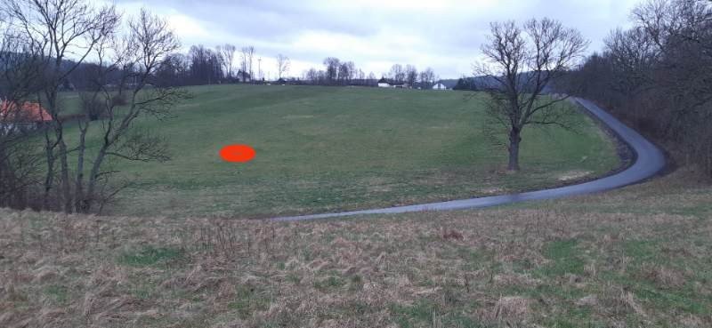 Dům bude stát zhruba v místech červeného fleku. Pozemek stavební je malý, asi 2000m², a je to nudle, v nejširším místě od silnice to má 30 metrů, na dýlku ani nevím, 200?