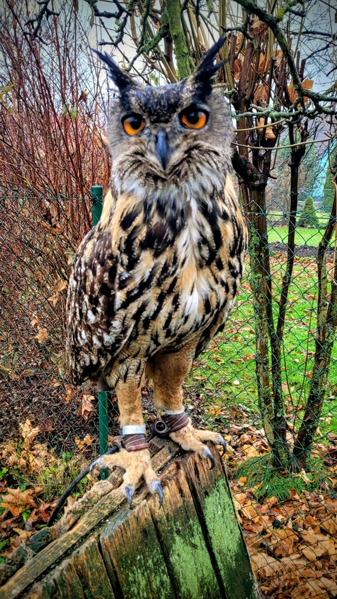 Je to odchov. Přes sezónu jezdí po ukázkách, aby děti a dospělí viděli jak vlastně vypadá naše největší sova.