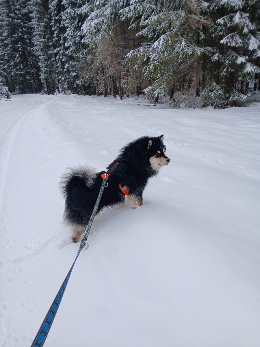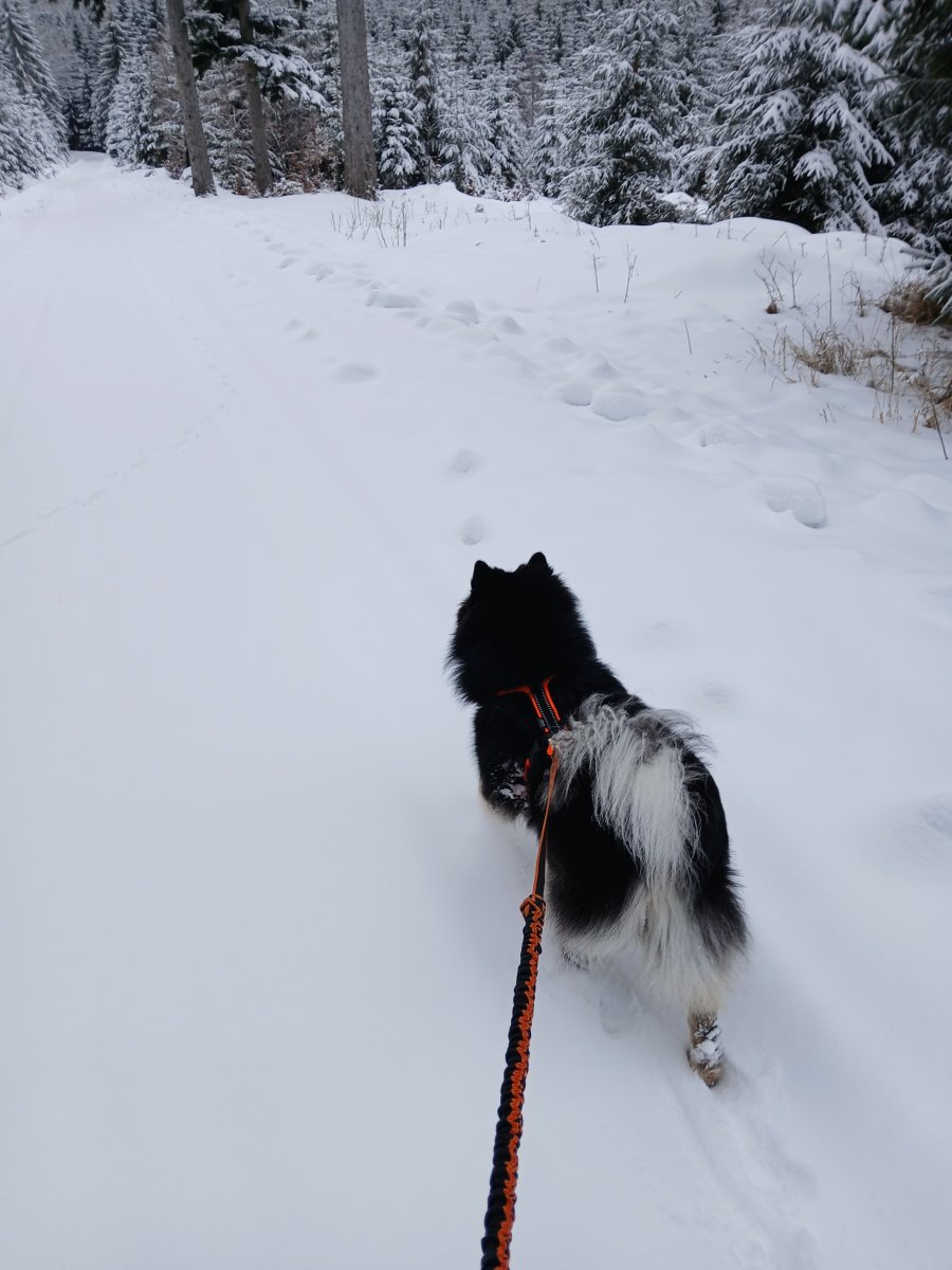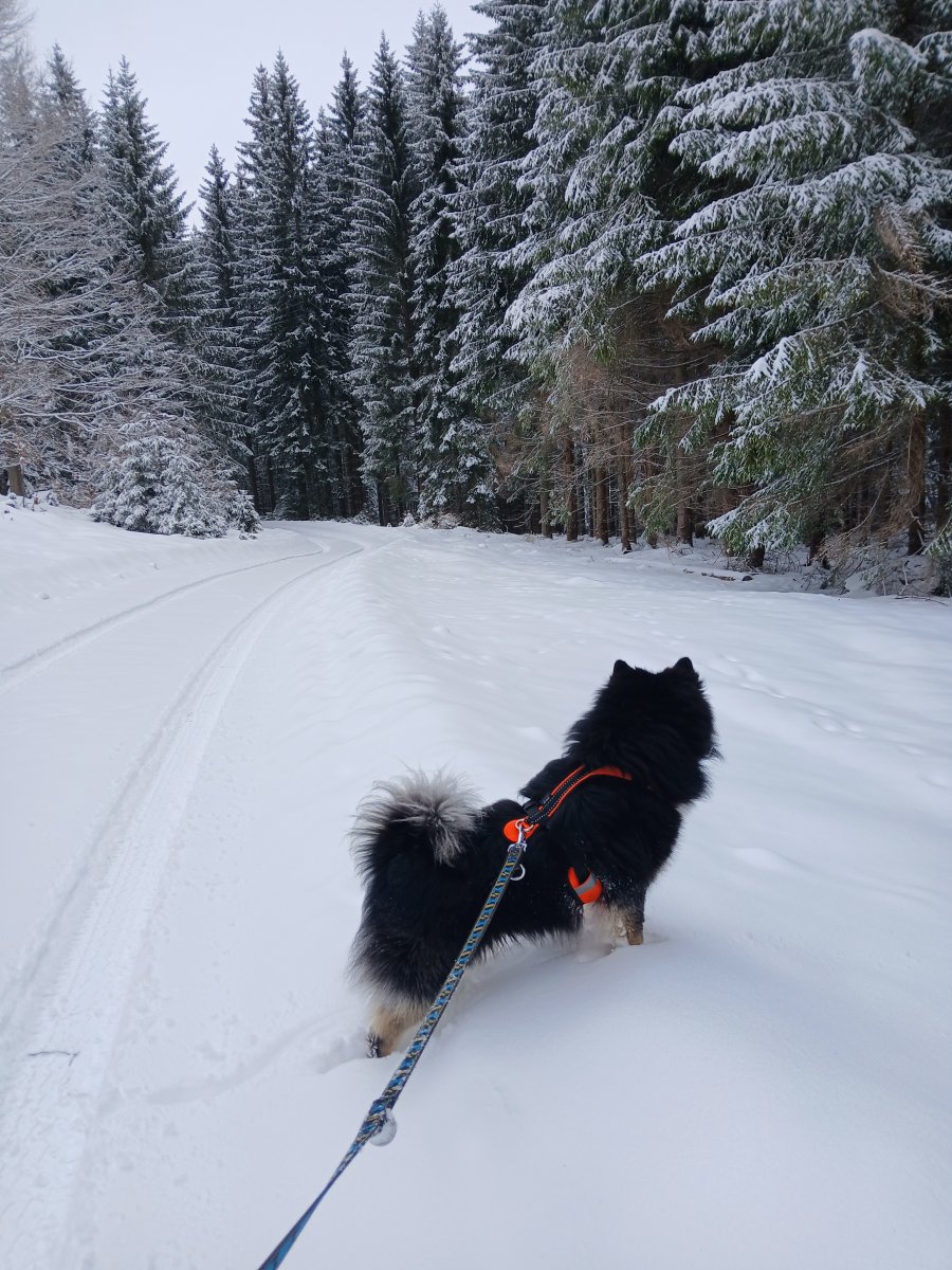 Dneska konečně vylezlo sluníčko. Jen moje maličkost krapet podcenila terén, kdy tři a půl kilometru plánované trasy vedla hlubokým sněhem, protože jsme byli první kdo tudy po několika dnech šel, a nakonec jsme si to raději asi o dva kilometry zkrátili po silnici. Tedy mladému pánovi to nevadilo. Ten má offroad. Ale mně se to brodění líbilo už míň. 😀 Ale les byl jako z pohádky.