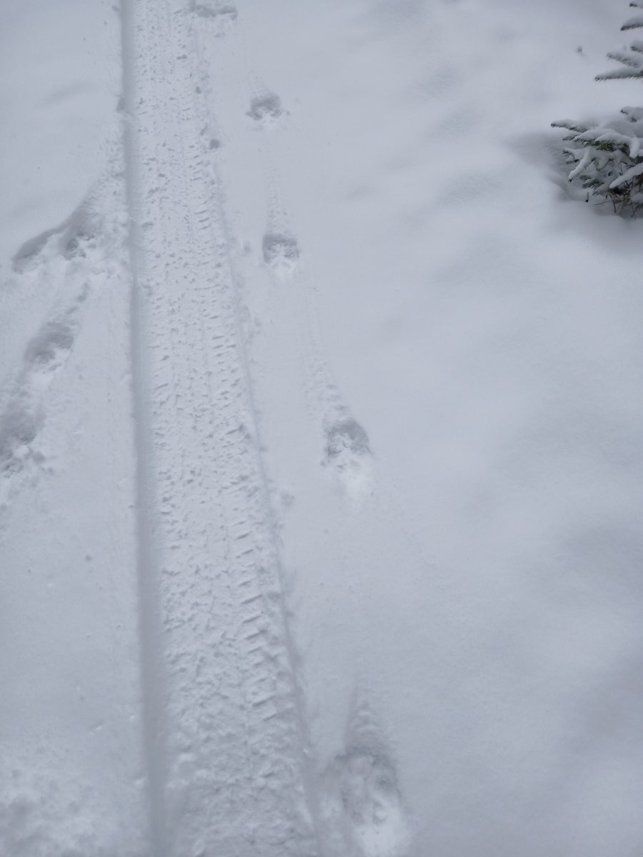 A opět dotaz… Koho jsme potkali tentokrát? Zase psí tuláky? Stopy vybíhaly a zase mizely v lese tak dva až tři kilometry od nejbližší vsi. Velikost jak od velkýho psa, ale pěkně v lajně. Byly dvoje nebo troje. Lidský ťápoty chyběly. Byli jsme podle stavu cesty první pěší minimálně od posledního sněžení. Bohužel fotka nic moc. Mobil mi tu bílou na bílý moc nebere a samozřejmě otevřít internet a porovnávat s nakresy stop mě napadlo až na ubytování a paměť je mrcha … ☹️ Jinak jsme zase potkali kromě kopýtek srnek, zajíce i liščí ťapičky.