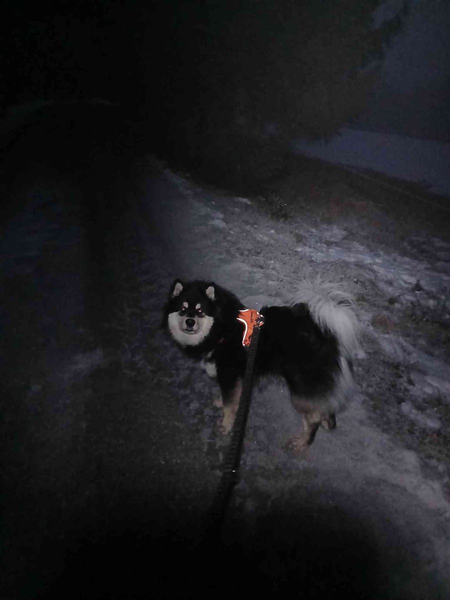 Zdravíme ze Šumavy. Dojeli jsme pozdě, takže první vycházka byla už za tmy. Do lesa se mladému pánovi moc nechtělo.