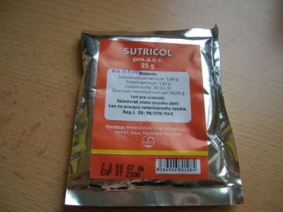 d.fojtik21406.05.2011, 13:17:42xxx.xxx.38.92 používá se 3-5 dní -.ředí se do vody(25 g na 4litry vody).Mě stačilo 100g sutricolu na 20 slepic .Dodržení ochrannmé lhůty na vejce 10 dní.k dostání u veterináře.cena cca 50 kč za ks -25g).Na kokcidiozu se dělají testy v laborce (přes trus).na podrobné používání se zeptej lékaře jestli zvolíš tento medikament.Myslím že se Surocol používá i , Salmonella, Klepsiella, Bordetella, Proteus, Haemophilus, Diplococcus, Enterococcus, Micrococcus, Streptococcus, Staphylococcus)