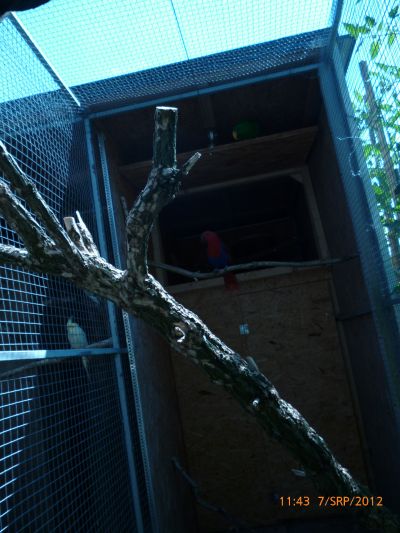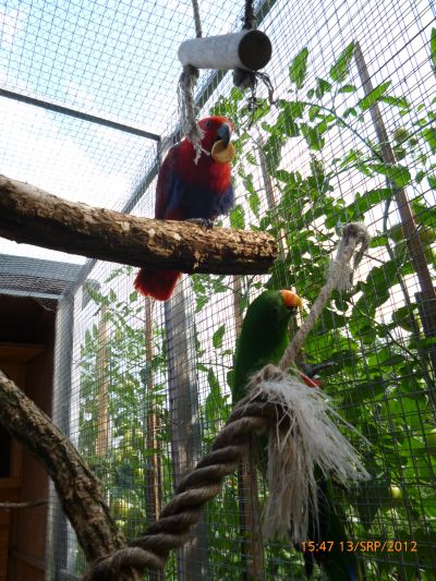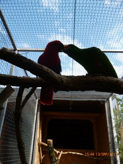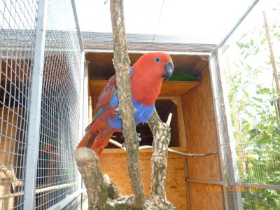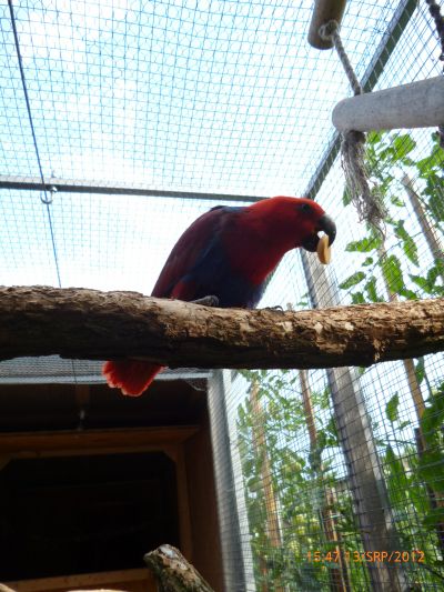 Po příjezdu domů taťka znovu obvolal známé, tentokrát s tím, jestli někdo neví o dvouleté samice Eklektuse solomonensis. Nakonec známý sehnal pár, hned z vedlejší vesnice. Byl už zamluvený, ale Pán, který se specializuje na amazoňany, kakaďáky a hlavně Ary po delším rozhovoru souhlasil, že mi samici nechá. Měl jsem teď nějaké peníze z brigád, tak jsem si samici zamluvil. Jde o samici z ledna 2011, ručně dokrmená od třicátého dne, mluví asi dvacet slov, krotká ale není - na ruku nevleze.