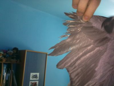 Teraz je pekná,chrbát jej zarastol,letky,no teda tie konce,len tie brká jej vypadli,rastie jej chvostík,Na krku sajej objavujú obluciky na pierkach,Predtým mala okolo krku len chmýrie.Takže to zarastenie bude trvat asi pol roka.