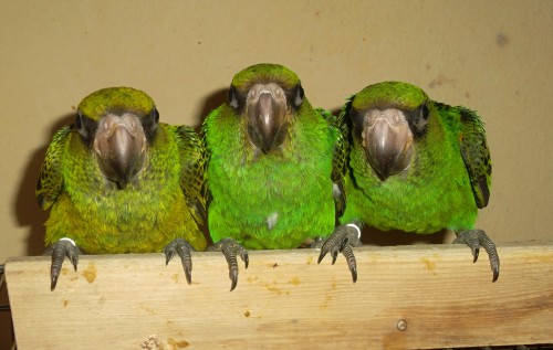 letošní mladí třitýdenní, již nakroužkovánáni papoušci konžští ssp. fantiensis