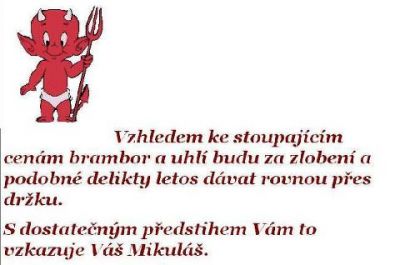 Orina (neregistrovaný)05.12.2012, 15:09:39xxx.xxx.23.32Jinak si dnes užíjte všichni Mikuláše a čerta a kdo zlobil dostane jen uhlí a brambory. No mně by se docela hodilo obojí :-)) :-D