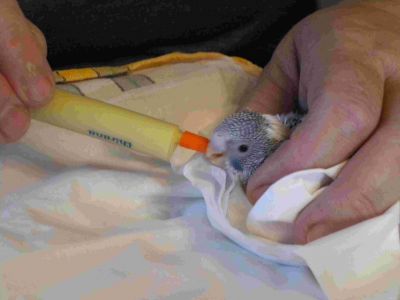 Obr. mládě andulky dokrmované stříkačkou s nástavcem rektální trubičky. Nemohu ovšem tvrdit že u arů, kakaduů nebo jiných velkých papoušků tado metoda vyhovuje, právě z důvodu stažení nástavce. U drobných papoušků se tak krmí lépe.