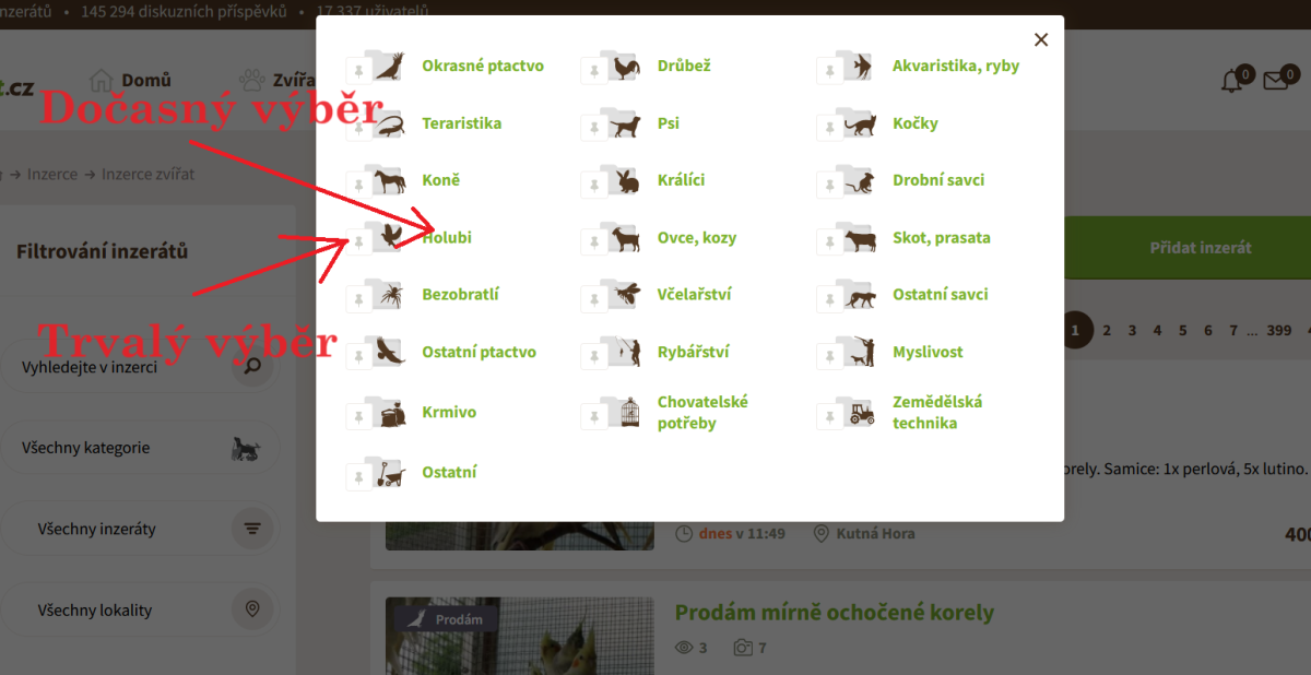 Funguje to takto: když v inzerci kliknete na kategorii, tak se vám ukáží inzeráty z vybrané kategorie, ale když přejdete do diskuze, zase jsou tam všechny kategorie. Pokud ale v inzerci vyberete kategorii tím, že zaškrtnete špendlík, tak ten pak drží při procházení celým webem. Takže pokud chcete aby výběr nedržel, neklikejte na špendlík, ale pouze jen vyberte kategorii kliknutím na název, viz. obrázek: