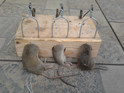 uvnitř každého tunýlku mám kousek chleba. Ty oka drží režná nit, kterou myš překosne, aby se dostala na chleba. Jakmile to udělá, oko vylétne a myš udusí. Tahle pastička je dobrá i v tom, že je tichá. Do klasické pastičky se často myš chytne třeba jen za nohu nebo ocas a pak s ní běhá po voliéře a může tak plašit ptáky.