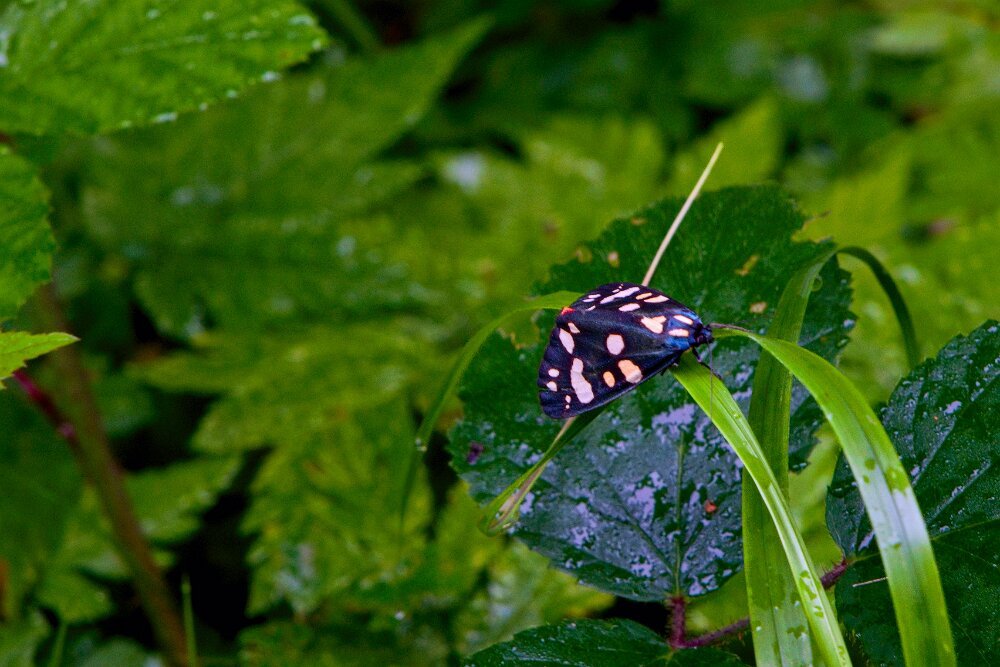Tipuju přástevníka hluchavkového. Žluté a bílé skvrny a červená vykukující spodní křídla. Takže za mě přástevník.