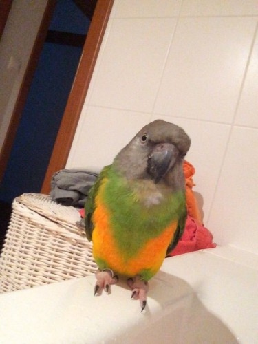 pro Pavlínu: je to aratinga zlatý, říká se mu také aratinga sluneční a žije v Jižní Americe. Je to běžně chovaný druh.