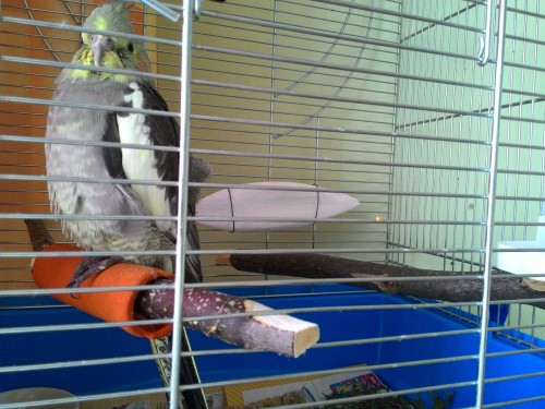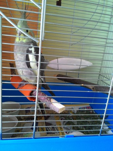 Naprosto souhlasím, bidýlka má velice nízko proto asi chodí na zem, není na bidýkách bezpečná a navíc je to pták. Proč má krmítka na zemi, bude v nich mít fekálie, ze znečištěné vody dostane střevní problémy a může i umřít. Korela žije ve větvých stromů, není to slepice, která bude zobat zrní z podlahy. Bude pokud nebude mít na výběr samozřejmě, ale necítí se přitom bezpečně a může se díky tomu i najíst málo a ve výsledku být podvyživená. Žádný pták nemá rád, když je nízko. Pro ukázku přidávám fotku vlastní klece s korelou. Nejlépe mějte i klec samotnou umístěnou ve výši vašich očí. Já třeba mám klec v pracovně, takže když sedím u pracovního stolu jsme si očním kontaktem rovni. Tak papoušek ví, že mi může důvěřovat. Nejsem nadřazená, ale ani podřazená což je také velmi důležité.