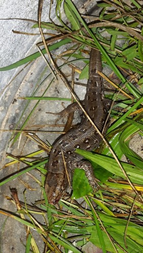 No, hlavně musíte zjistit, zda patří do naší české přírody (je to chráněný přírodní živočich), nebo nepatří, a to znamená, že někomu utekl nebo byl vyhozen z terária. Hledejte fota ještěrů, ptejte se v nejbližším muzeu, ve ZVERIMEXU, v ZOO, hledejte v knihovně v Atlase plazů apod. Dočasně ho umístěte u Vás doma v terariu, v teple v prostředí s teplotou nad 20°C .Dejte mu těžkou čistou keramickou misku s čistou pitnou vodou, aby se mohl napít, a nepouštějte do jeho blízkosti žádná zvířata ani děti. Napište, jak je dlouhý.