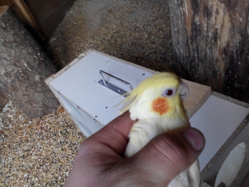 samec žlutá hlava s červenou ušní barvou..letky bílé..spodek ocasu černý...