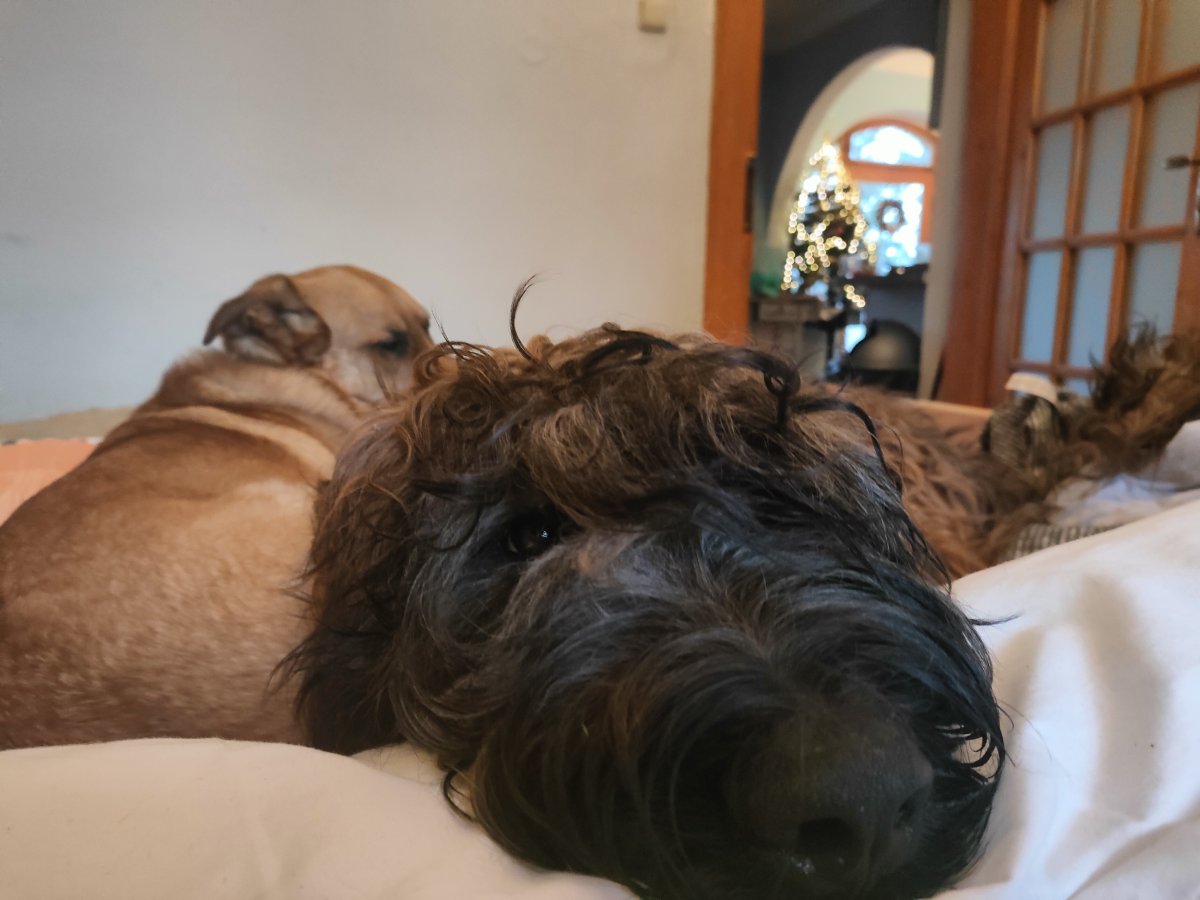 Takže neustálé přivolávání, chůze u nohy, pořád jsme se zastavovali abysme si se sousedy popřáli hezké svátky . Psi z to ho byli utahaní, jako by uběhli sto kilometrů 🤣. Dostali večeři dřív než obvykle ( podávaly se těstoviny vařené v kuřecím vývaru s vepřovým masem a všichni si dvakrát přidali 🤣) a pak usnuli jako dudci a my měli celý večer klid.