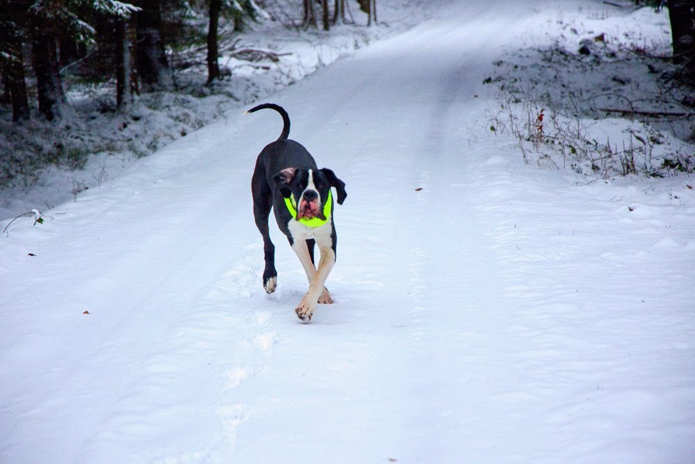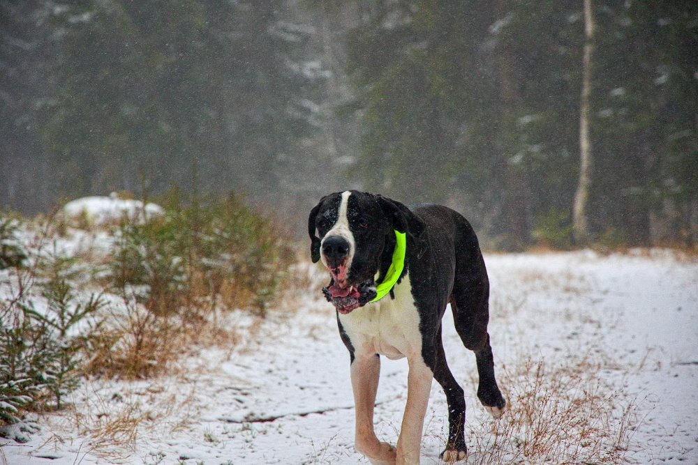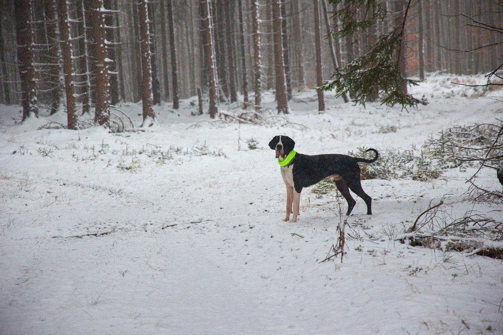 Nejprve fotky psí… Je vidět, že ráno byl poprašek, teď je poctivých 30 cm a sype a sype. Ale obleva už se blíží a s ní bahno místo čistých tlapátek