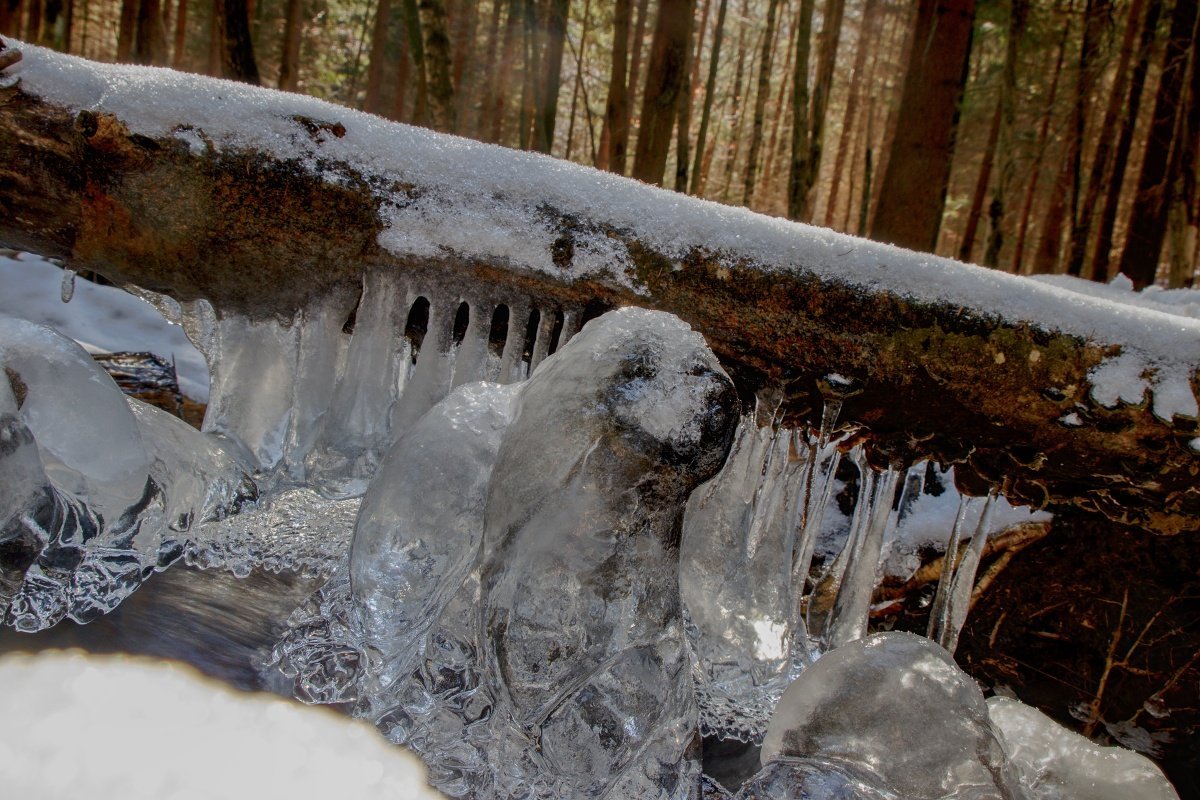 my teď byli v lese něco přes půl hodiny - sluníčko svítilo, potok byl krásně orampouchovaný… sluníčko vytáhlo teplotu na jen mínus šest. A to už šlo.