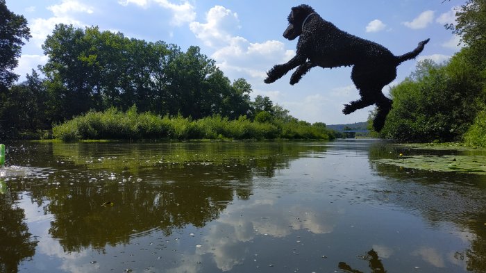 Ano, zvláště černý pes má problém z rozlišováním doby vhodné a nevhodné na koupání. Třeba když nejbližší civilizační stopy jsou cca 5 kilometrů vzdálené, půdu pokrývá sníh, na břehu řeky je nad hladinou ledová krusta zasahující několik metrů do proudícího koryta a NA ÚPLNÉM KONCI TÉ KRUSTY SEDÍ KACHNY. 🙄