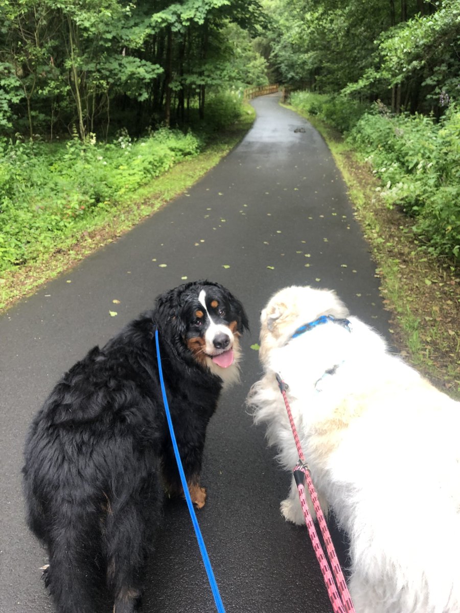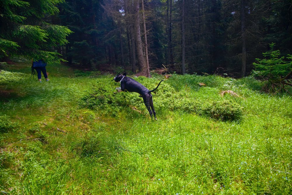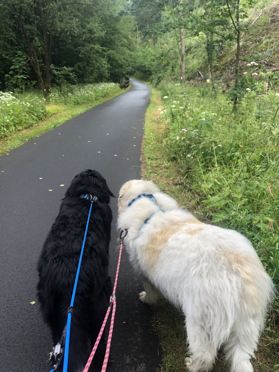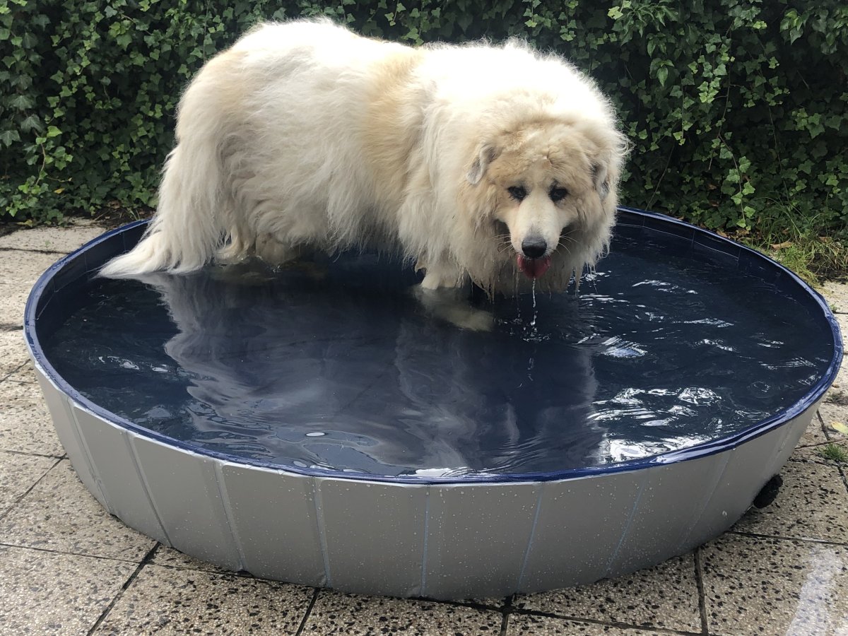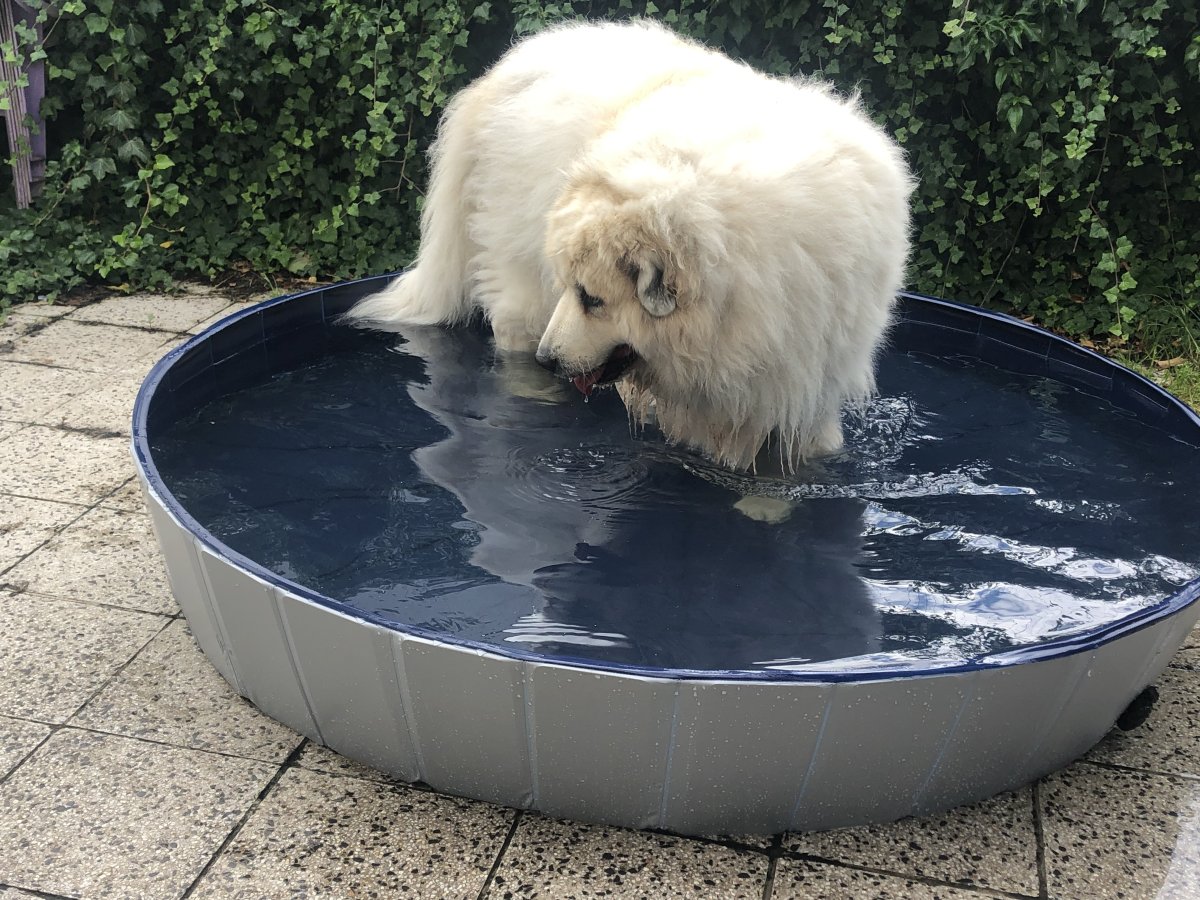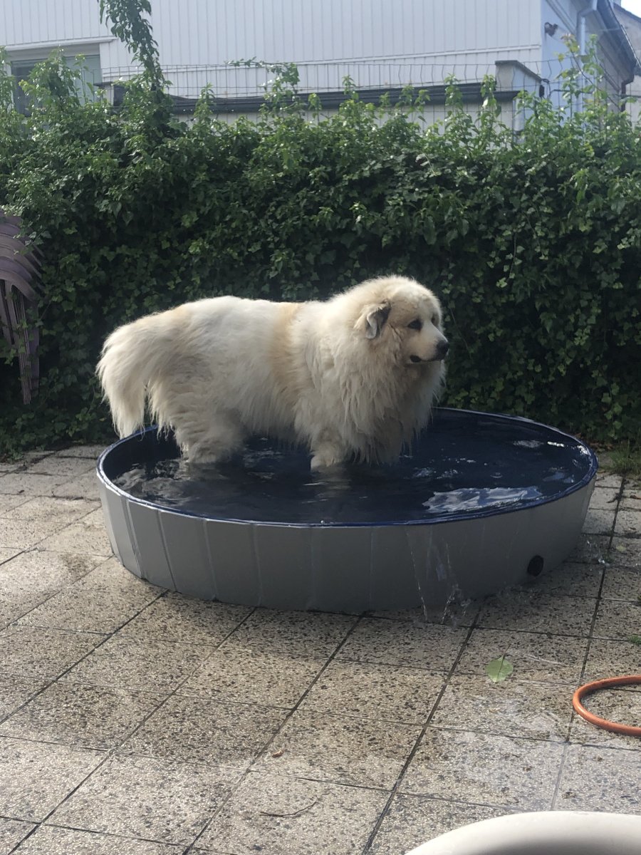 Já jsem Gindě koupila bazének, aby se měla kde brouzdat… tak nejdřív jsme napouštěli, pak procházkovali…jako dneska to bylo podivný, vyjeli jsme do údolí, kde je chladněji než ve městě .. ještě jdeme kolem potoka po cestě lemované stromy… po dešti skorem všecko mokrý, žádnej hic, zataženo, trochu pofukovalo, občas mrholilo.. tak to vypadalo ideálně, ale nebylo, bylo jak v sauně, za chvíli jsem byla zpocená jak myš. Pak mi to na jednom dřevěným mostku uklouzlo a buchla jsem na zadel… tak to ještě pohoda, vodítka furt držím… hlavně to Ginino… jenže, jak si pesani všimli, že se jim panička válí na zemi, tak hrrrr ke mně a zachraňovat … no komedie, než se mi podařilo se posbírat a vymotat z vodítek, tak to chvíli trvalo… ještěže se neobjevili žádní svědci… no a pak jsme jeli dom dělat cáky cáky do bazénku..