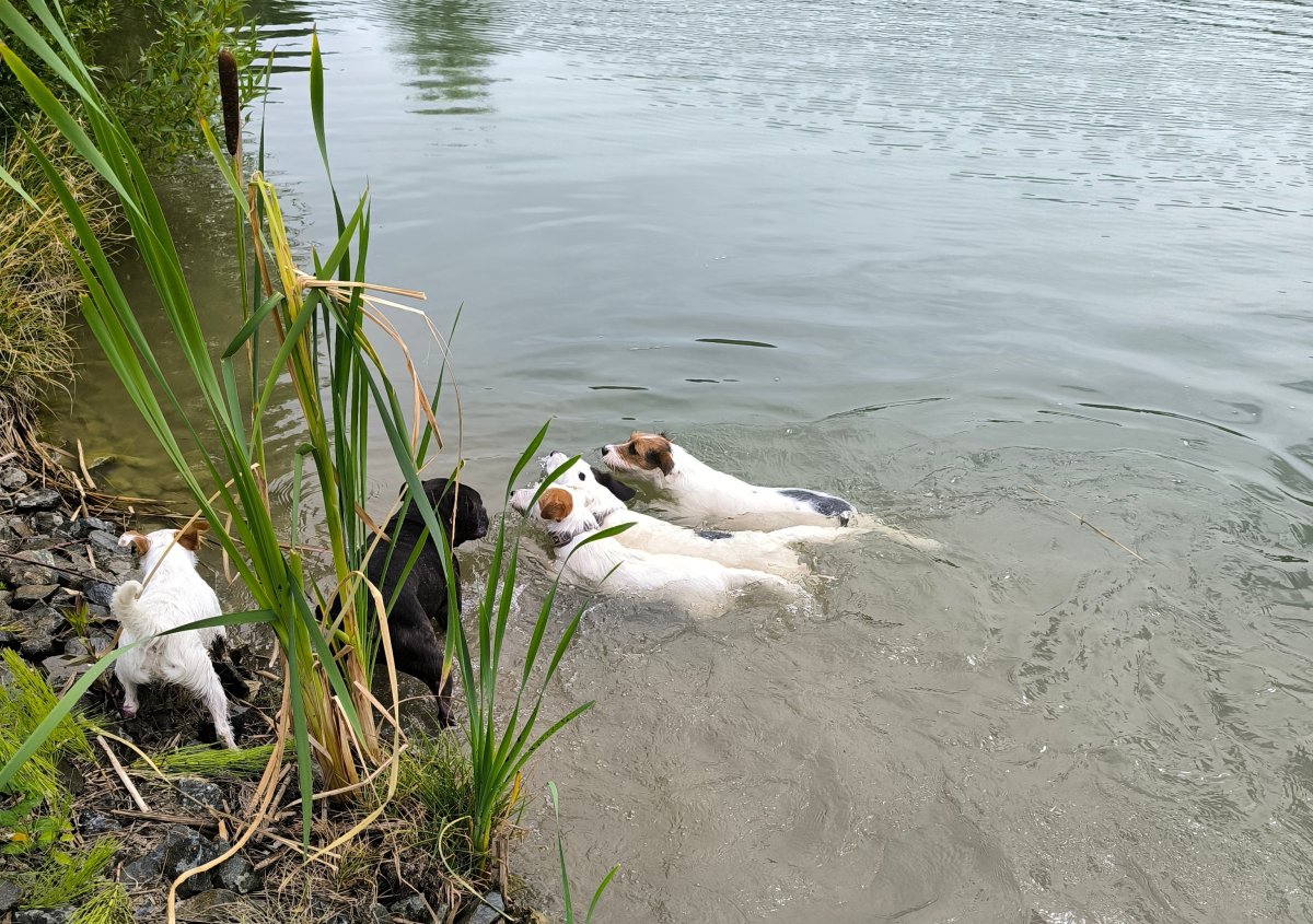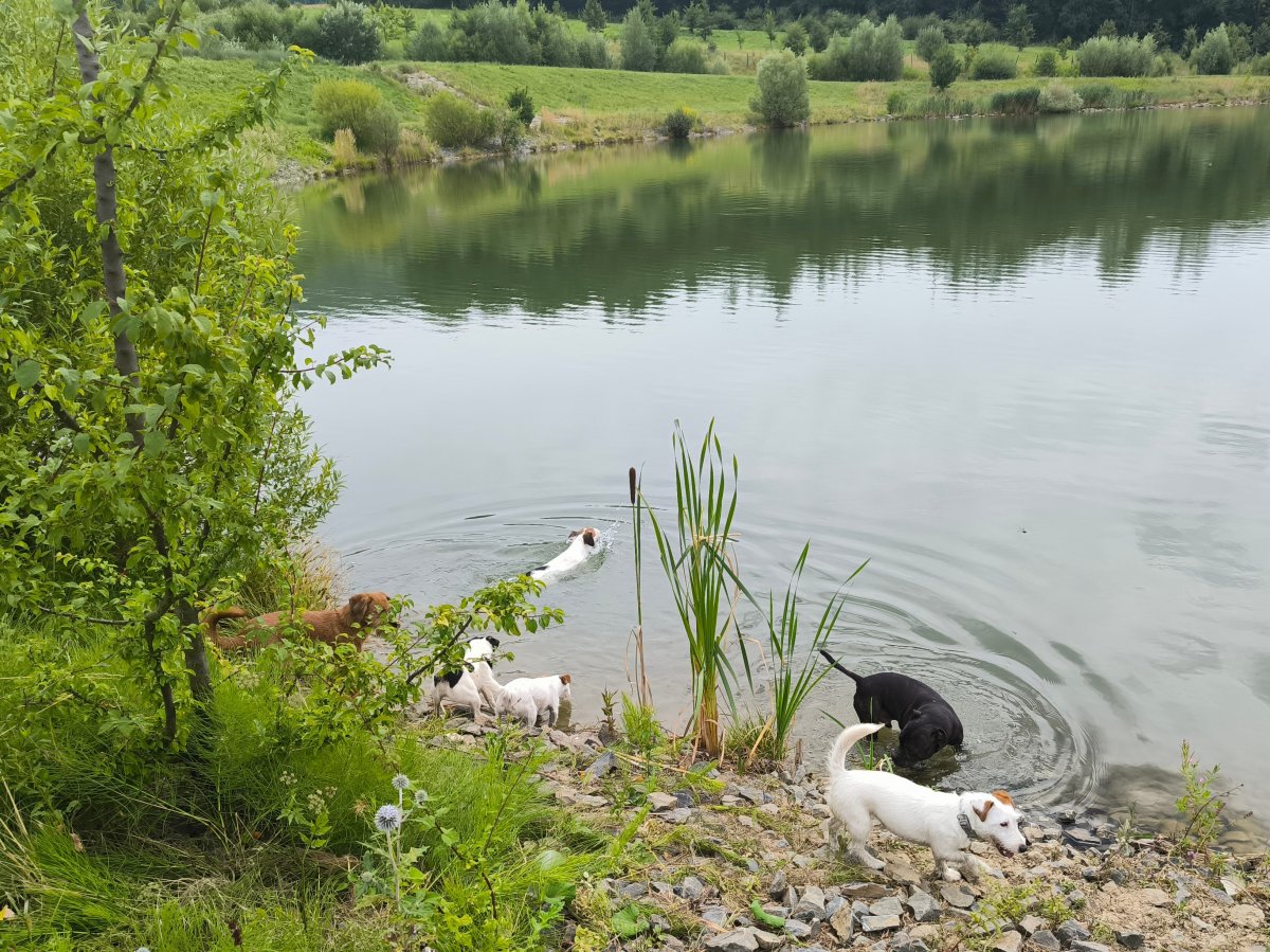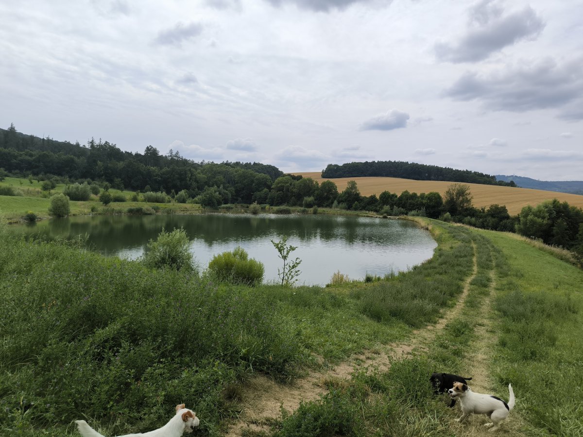 Cestou zpátky jsme jeli kolem takového pěkného rybníka, tak jsem to tam zapíchla a psi se mohli okoupat do čista. 🐶
