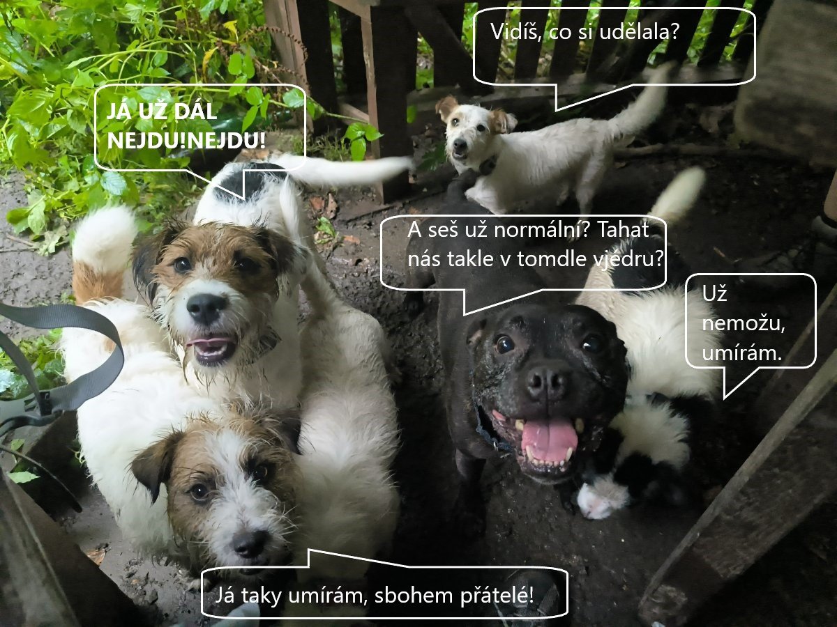 Teď se tu doma ploužím se zablokovanými zády a lýtka mi doslova hoří. Zítra neudělám ani krok. Ale tak hlavně, že psi jsou spoko. 🤭