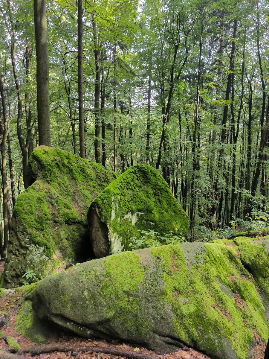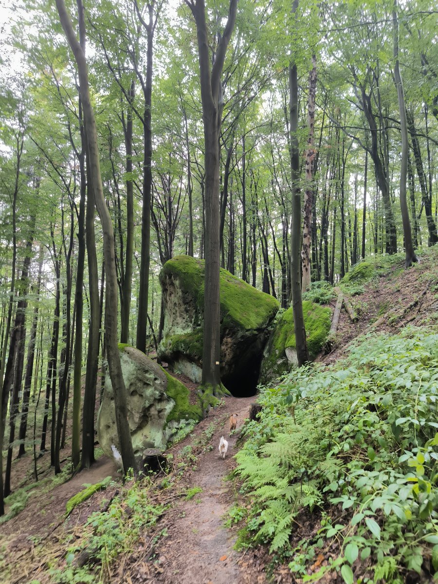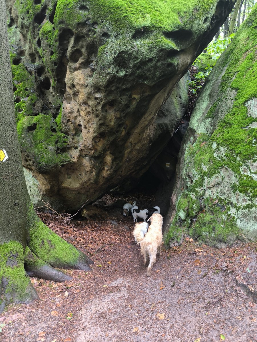 Trasa se jevila úplně parádně a prošli jsme si nádhernou cestu lesem. Trošku jsme zmokli, trošku jsme se okoupali průchodem lesním tunýlkem a pak jsme scházeli kolem nádherných skal po stezce Zdenka Sedláčka. No ale já si vymyslela, že se chci podívat na skalní útvar Miláček. A to byla největší blbost dne. 😂 Krpál jak kráva. Už tam nikdy nejdu. 😂