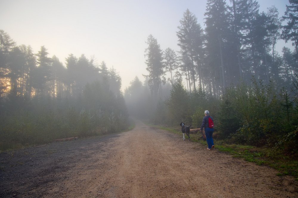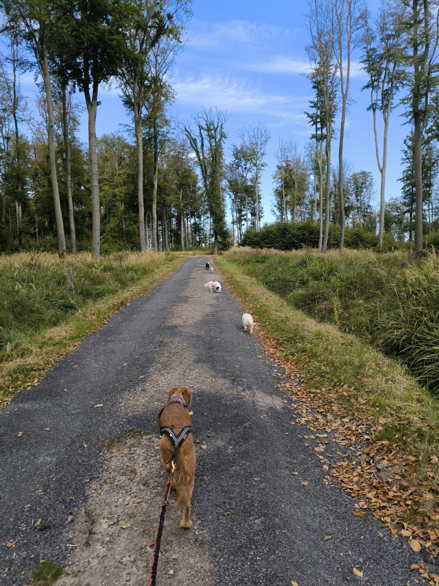 Nejlepší byl průchod Starou Hutí a paní, co tam pásla slepice. 🙄 Držím psy na vodítkách, peskuju je a zapomněla jsem, že jde Réma na volno. No, tak se pipenky trochu proběhly. 🤐