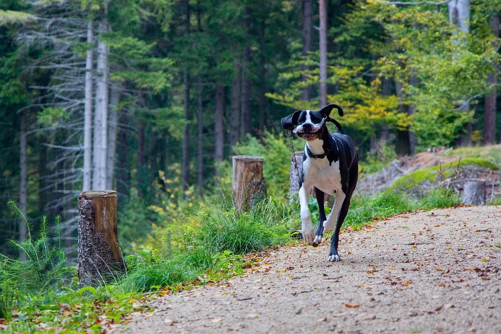 Když běhá lesem, tak bývá na dohled, vždy o nás ví a užívá si pohyb třeba v několika bláznivých okruzích… Často ho k tomu vyprovokuje pohyb třeba ptáka - nejde po něm, jen řádí. I míhající se stíny větví ho umí rozjet. Ale nikdy se zatím nedostal do situace, kde si neuměl poradit. Až tady…