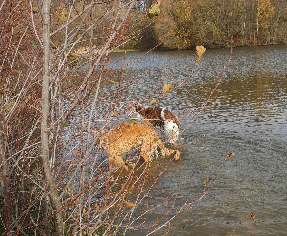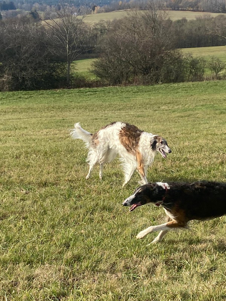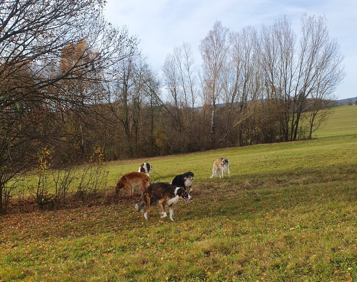 Dnes jsme se venčili přes poledne s částí smečky naší paní chovatelky. 5 barzojích kluků, trikolor je tatínek kluků a ten červený je vlastně ještě mimino. Jako doprovod měli 4 lidský holky. Bylo krásně, kluci nás obíhali v obrovských kruzíc a zvládli i koupačku. Prý, že je 6 stupňů nevadí. Pořád říkám, že nejšťastnější barzoj je jen ve smečce.