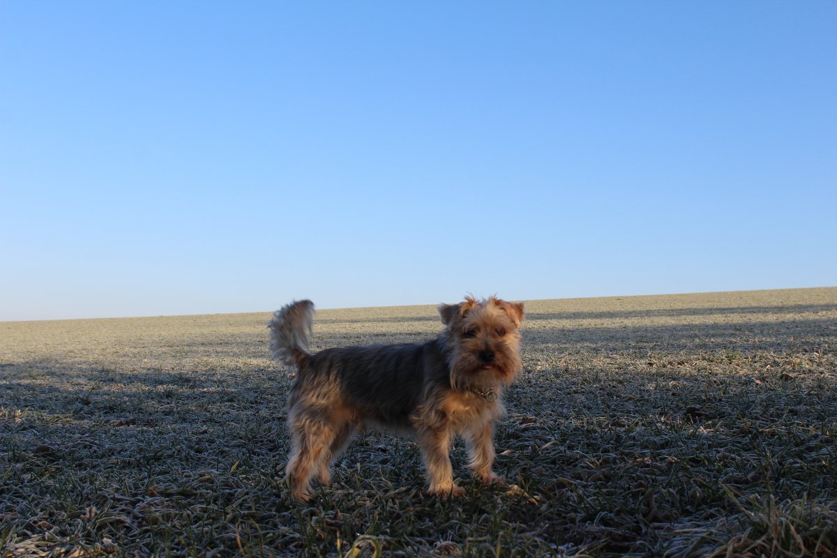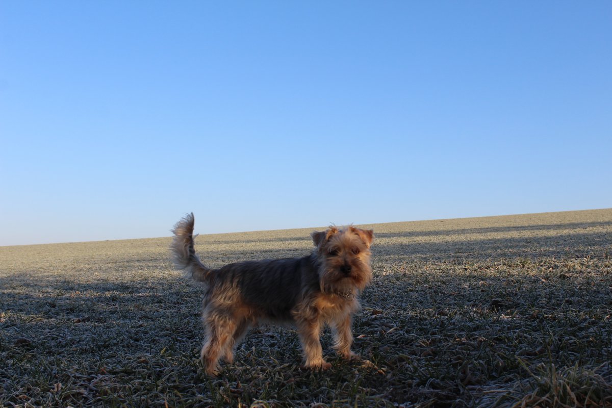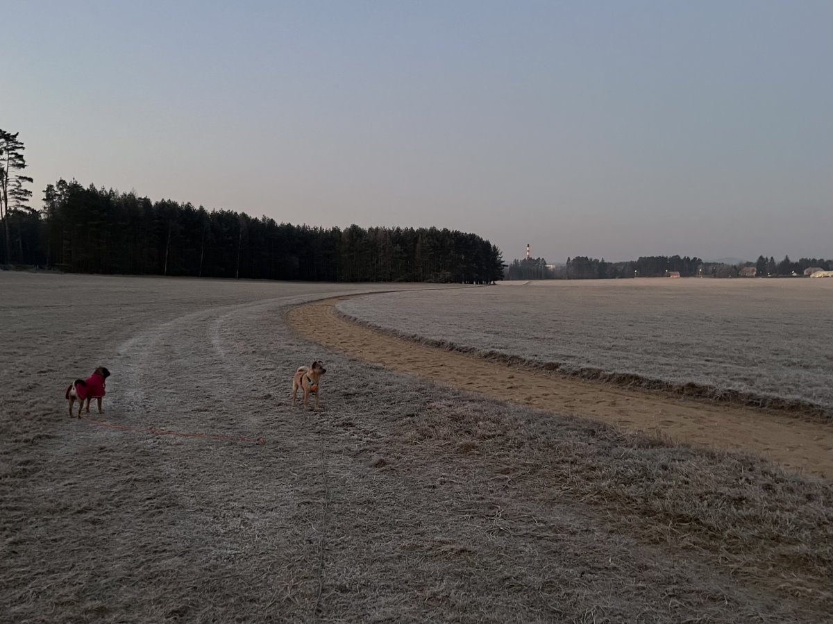 dnešní ranní vycházka-každej extra-Žeryk kousek mezi pole,hraní,a dom