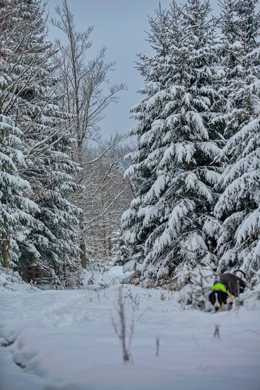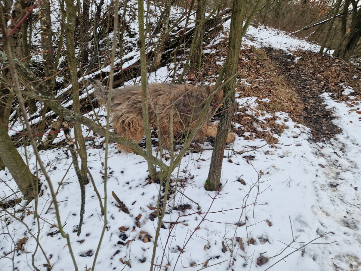 u nás ráno skoro jasno - ale teď se začíná natahovat oblačnost a sluníčko mizí. Mrazivá jasná noc, sněhu máme asi nejvíc za celou zimu. Na procházku do lesa nafasoval Yoda kabát, přeci jen mínus osm už je dost. A nešli jsme na dlouho, slabá hodinka to byla