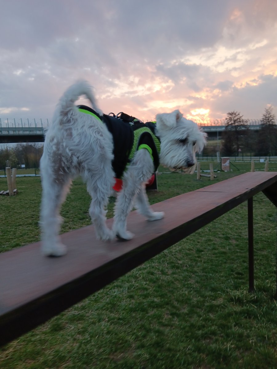 Zkusili jsme zánovní psí hřiště a bělouš má rád pochvalu, tak se předváděl, akorát už tu nikdo jiný nebyl, jenom panička. No chválila jsem, protože zvládnul všechno pro malé psy.❤️ Jsem ráda, že to nezapomněl. Na staré hřiště jsme dřív párkrát zašli 🐕 mají tu ten super patník na značkování a vzkazy 👍