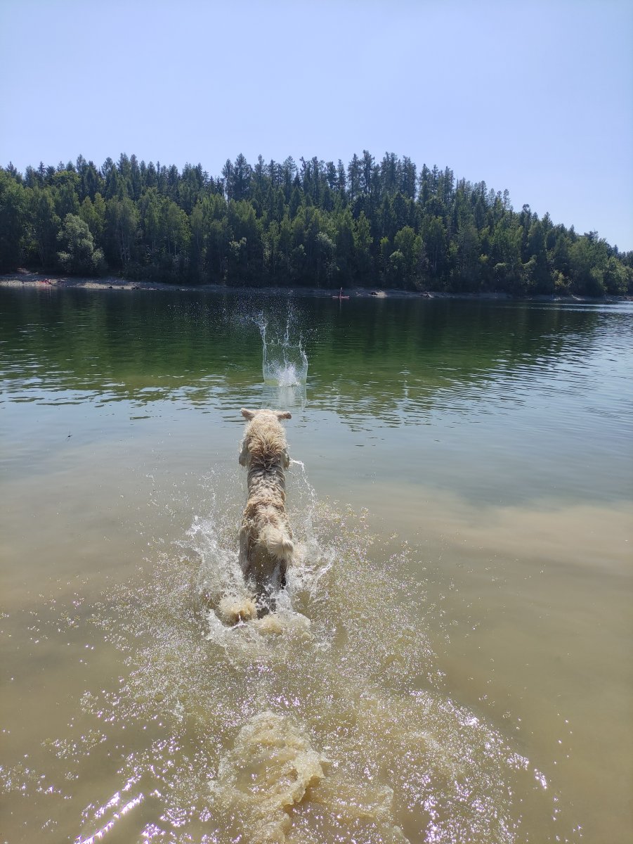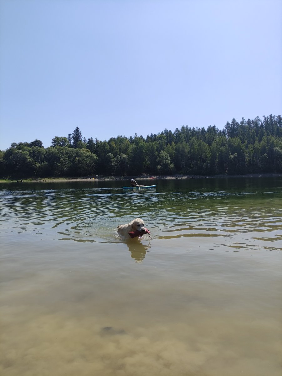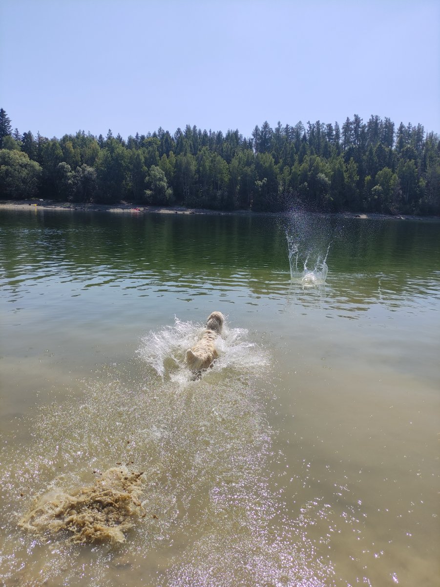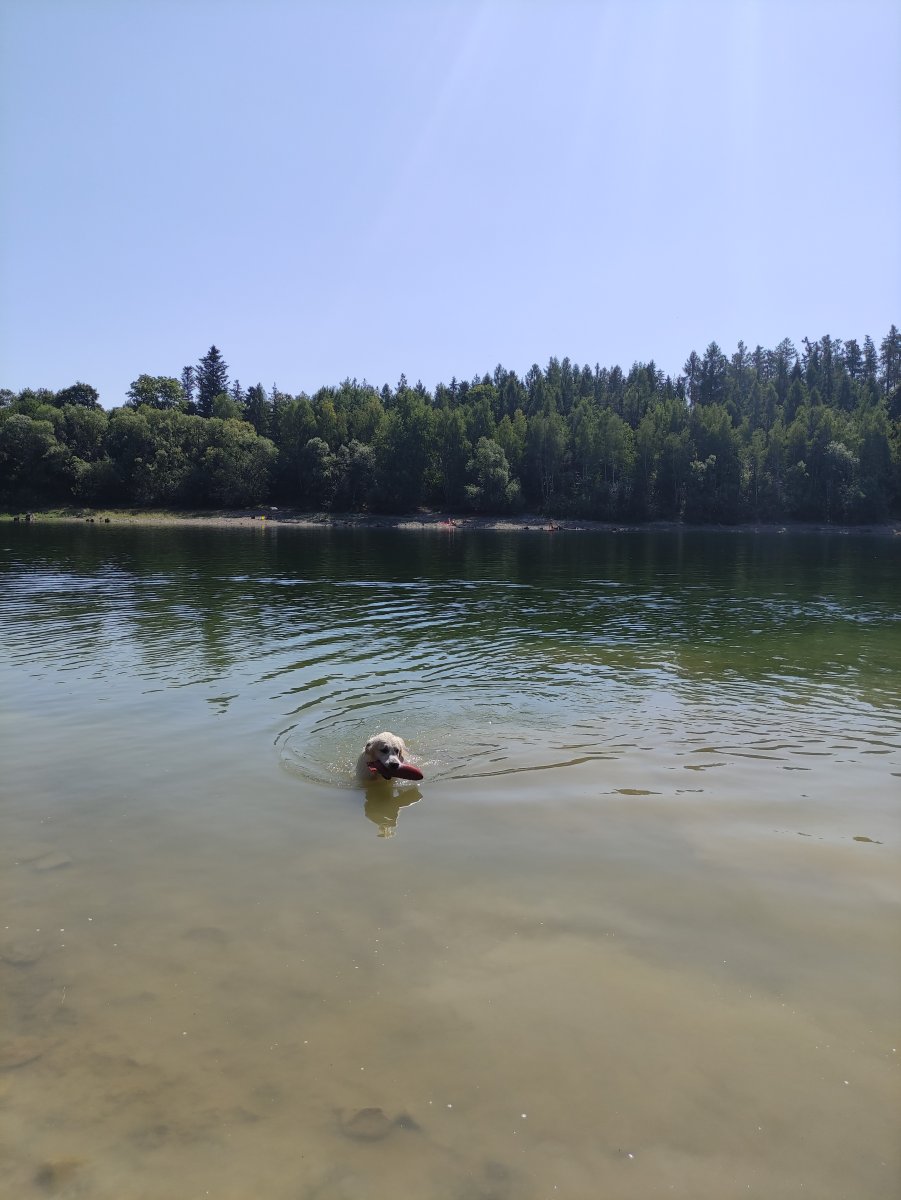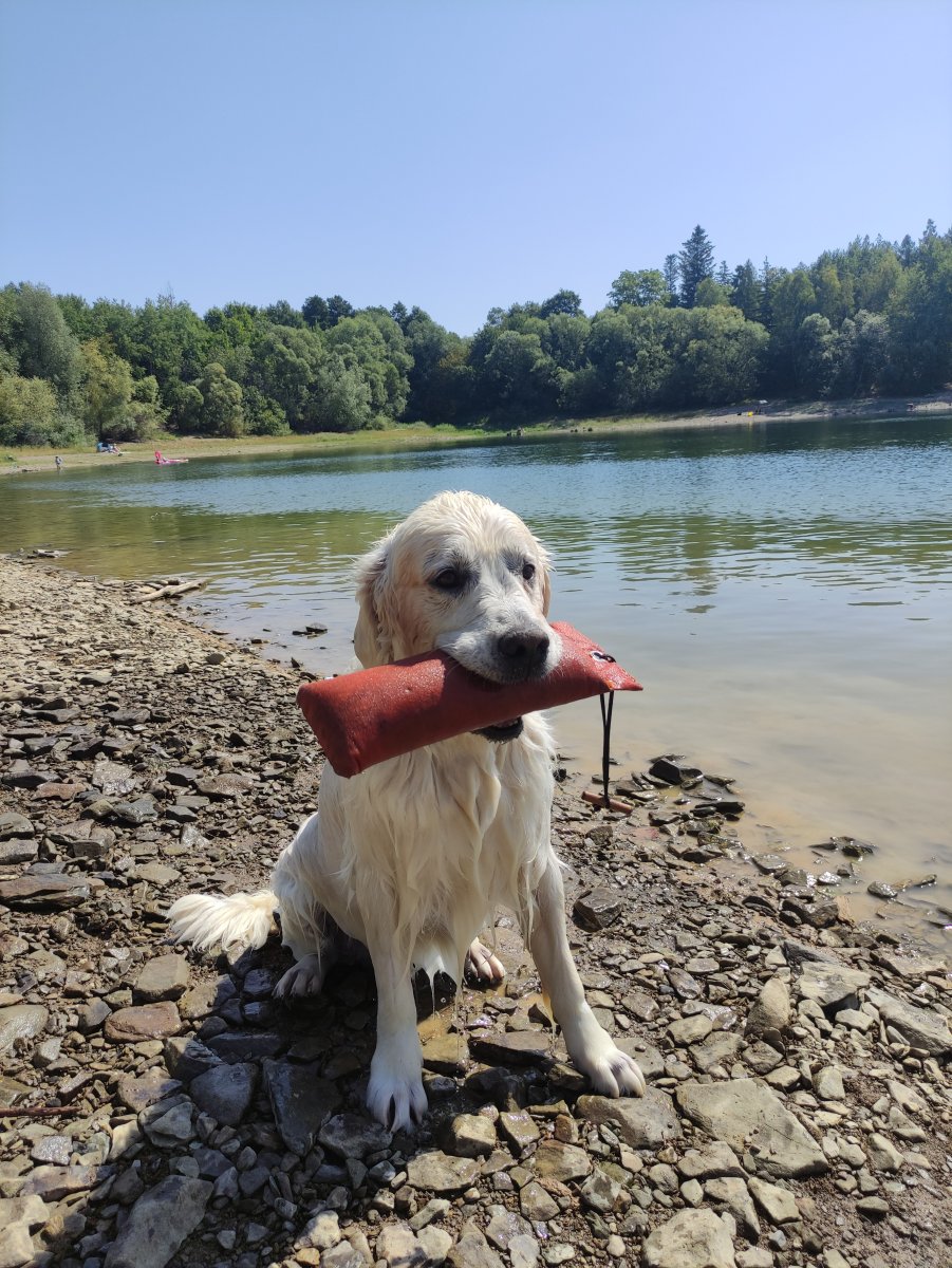 Dnes dopoledne jsem byla na Hartě vykoupat Dráčka a Cherry, trošku jsme aportovali, bylo moc lidí. Příště musíme jinam, než do naší oblíbené zátoky. Vyfotit se mně podařilo jenom Dráčka.