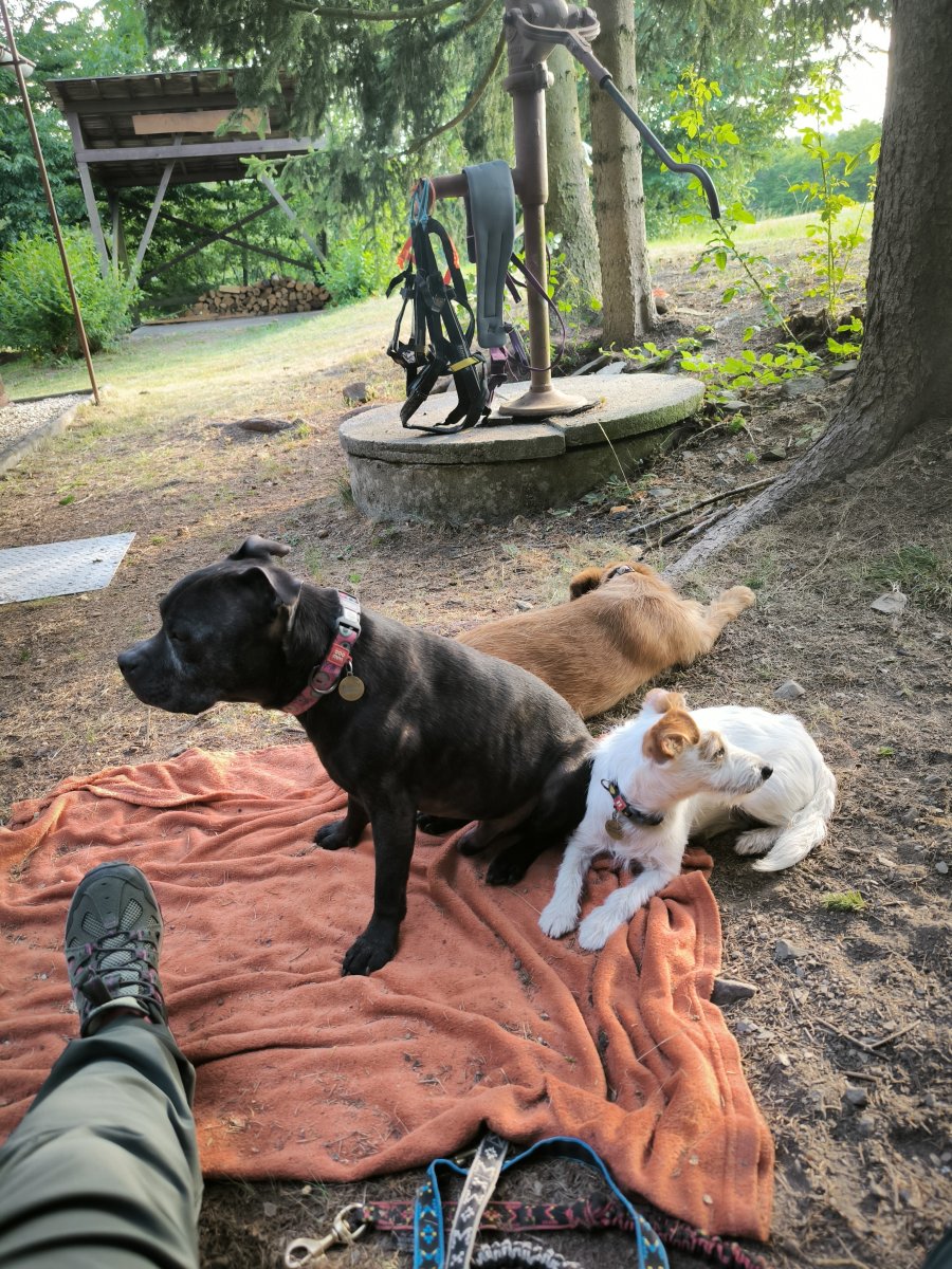 Po krmení jsem většinu zavřela do chatky do klecí a venku zůstali jen kluci. Už byl večer, ochladilo se, já si nalila víno a oni si mi lehli pod nohy. A normálně si lehli tak, aby každej viděl na jinou stranu. 😳