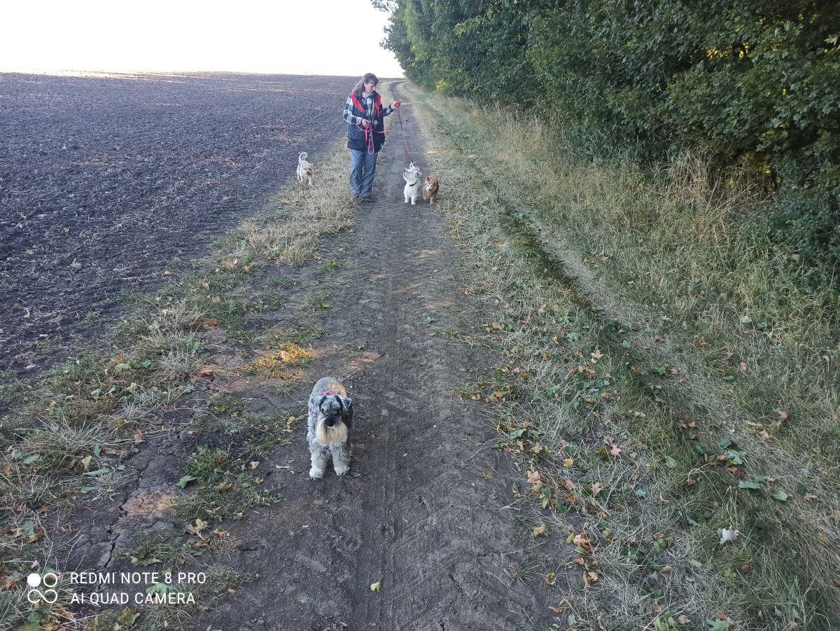 dnes jsme vzaly všechny 4 k lesu k VYŠKOVU-kousek projít-Dafi napřed spokojená-pak zjistila,že jdem podél lesa a nejsou pařezy,tak se táhla,Maxík si čmuchal,šel blízko mě a občas si sedl bez povelu umě a dostal pamlsek-Max sedne a dostane pamlsek-PES CVIČÍ PSOVODA-VELMI KYNOLOGICKÉ😀Betty se plahočila,protože hoopla z auta…a Žeryk přeštastně válel furt a stále sudy😀