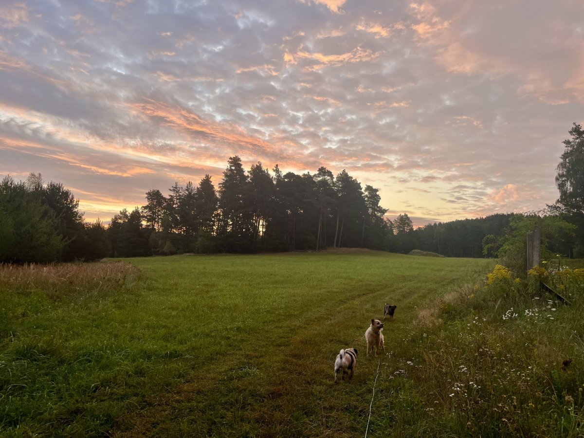 U nás dneska takhle. Tyhle pozdně letní rána miluju ... V plánu byl (nejspíš) poslední dlouhý běh (pro mě aspoň 22km) před podzimním maratonem. Počasí parádní, bylo nádherně, příjemná teplota, mlha. Vyběhla jsem před svítáním, tak abych nemusela s čelovkou. Na to že jsem si o víkendu běžela Jizerskou 23km, se mi běželo parádně a i tempo se drželo samo, měla jsem v plánu se držet kolem 5:30-5:35, nakonec to bylo o chlup rychlejší... Tohle ranní běhání se mi líbí. Jen Efíka jsem po 20km odvedla dom, už mi na něj těch 30km přijde dost. Ale i on vypadal hodně spokojeně, jiná trasa, koukal, čuchal , ale šel hezky v tempu se mnou... A jinak Efík teď v pohodě cystiny pod kontrolou i na skoro normálních granulích. Jen jich má vzhledem ke svému pohybu slušnou hromadu... A packy taky ok. Na podzim plánuju zase běhat na Kokořínsku v lesích. A já si snad příští rok dám první opravdový ultra... Zatím mám v plánu celýho "Čerta" - skoro 67km, přes 1600m převýšení, Bezděz, Ralsko...