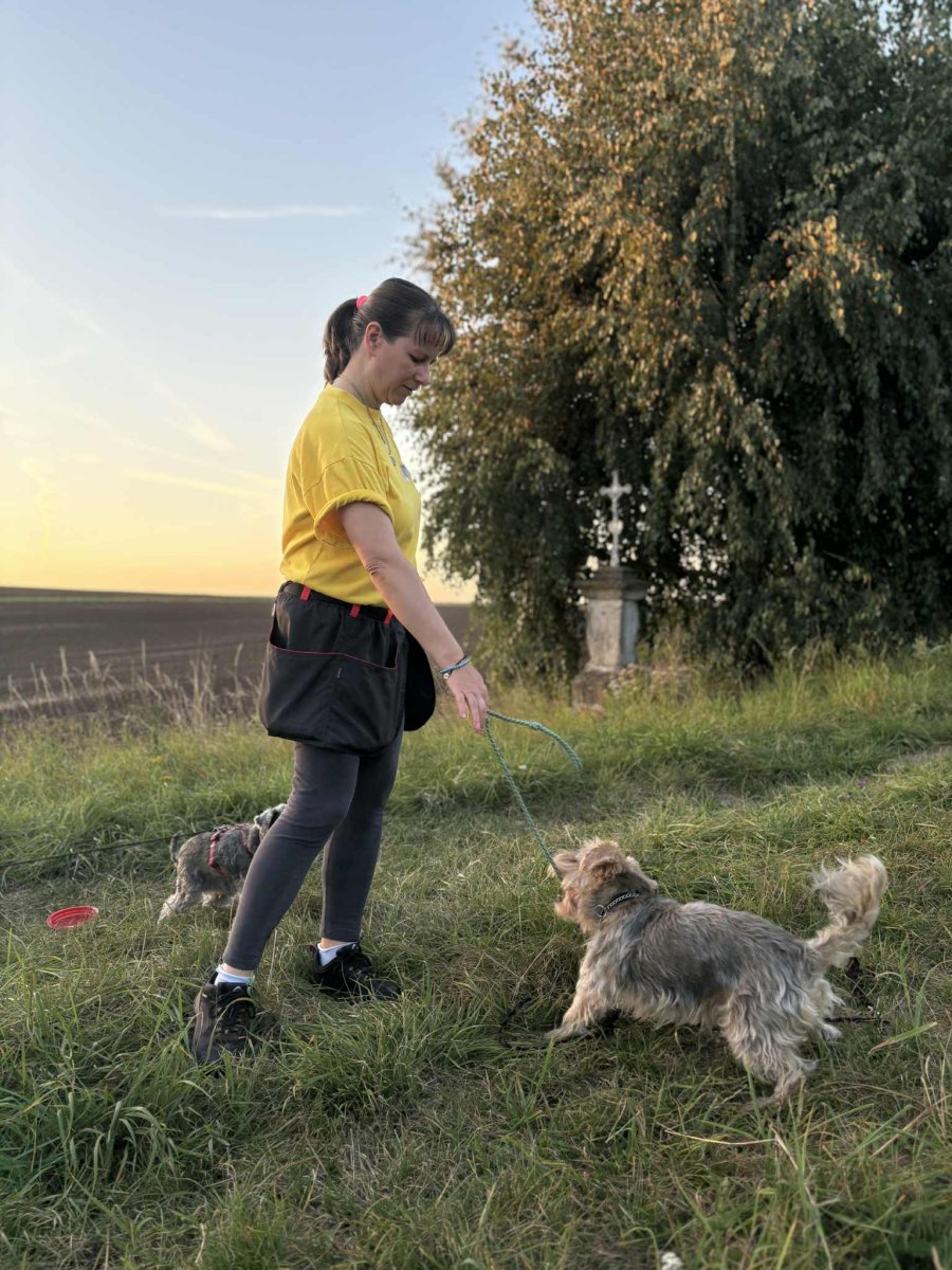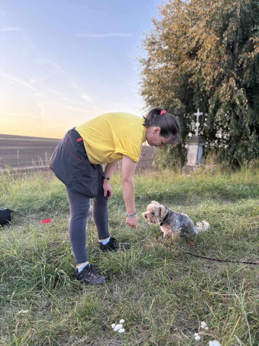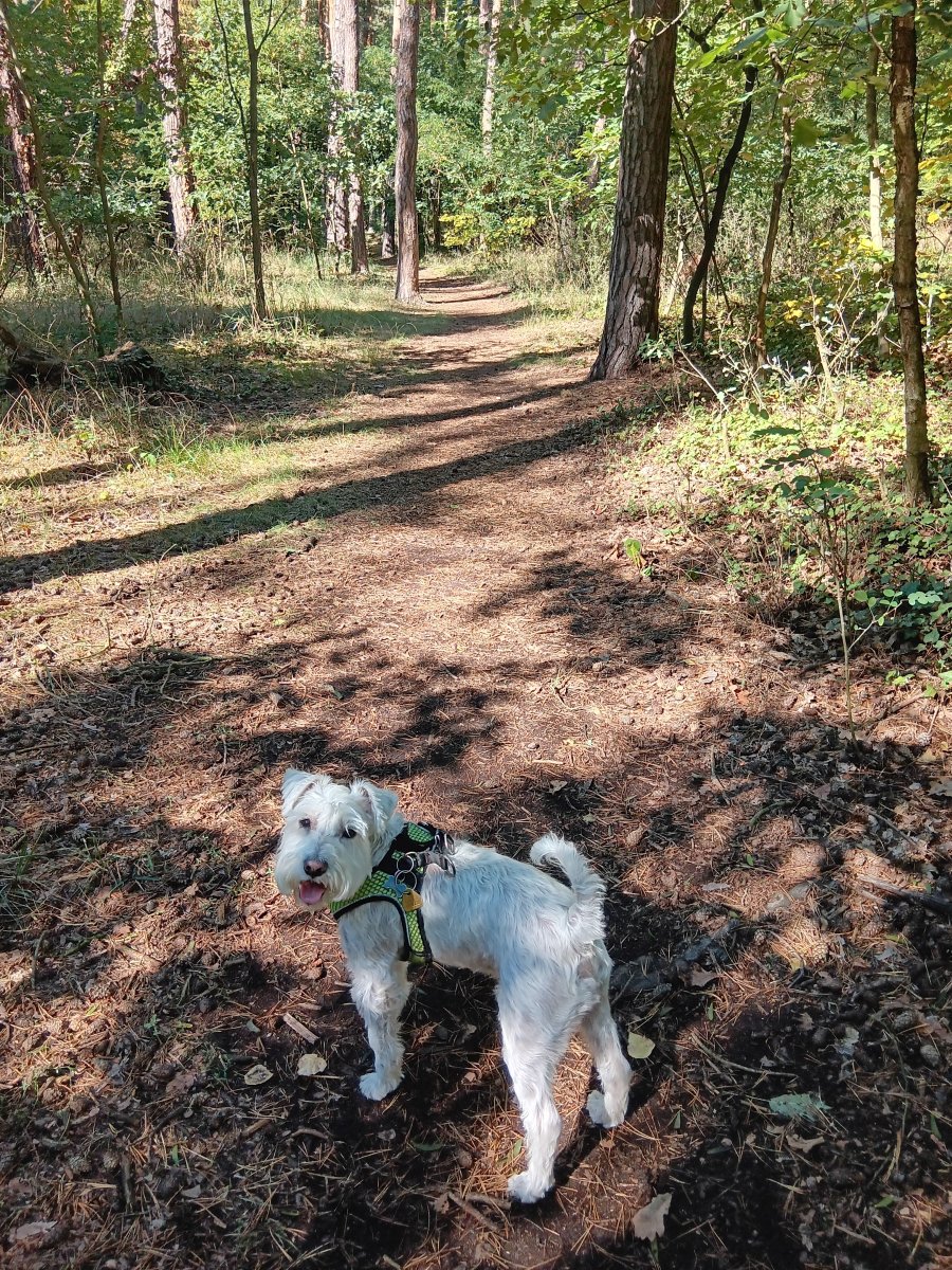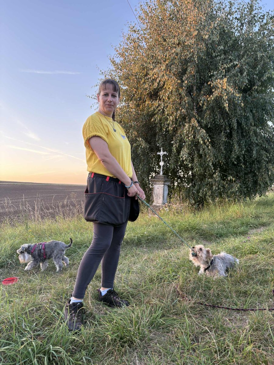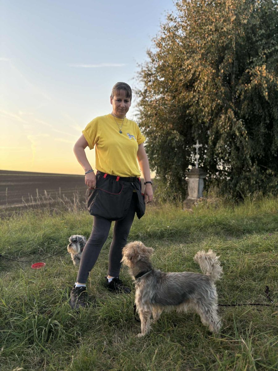 no já měla včera cvičící vycházku u křížku-to je naše duhá nejbližší trasa-s kníračem Brickem,-musím pochválit Dafi,že přestala hudrovat po pár metrech,u křížku cvičily hezky všichni 3-poslušnost po jednom+s Žěrykem i odložení v řadě…,