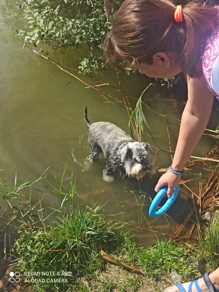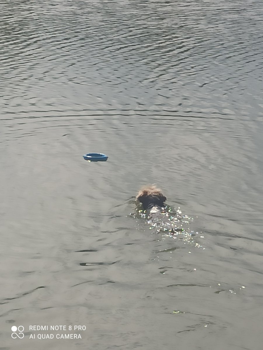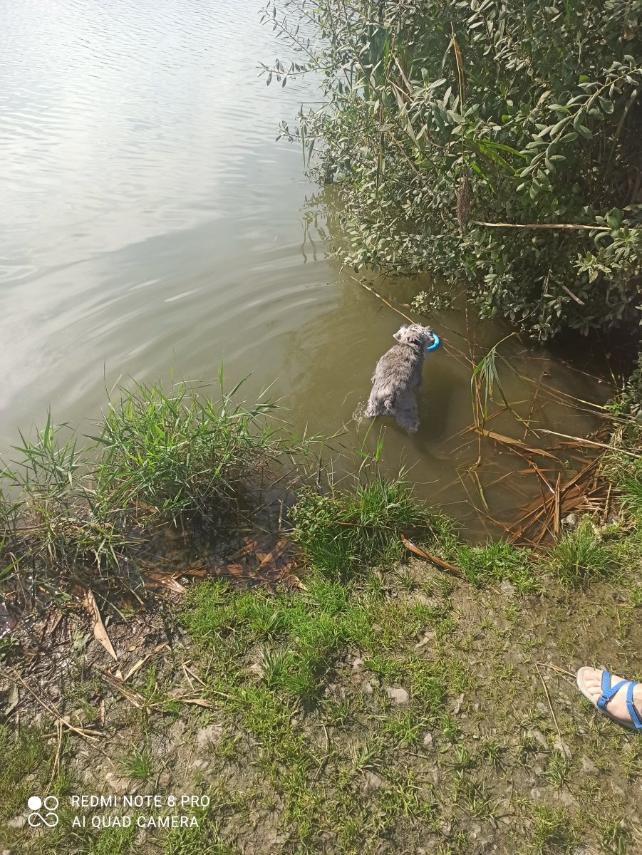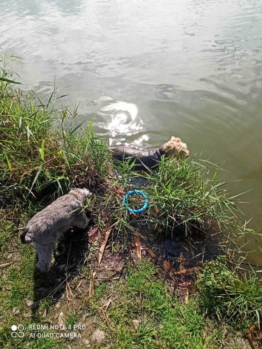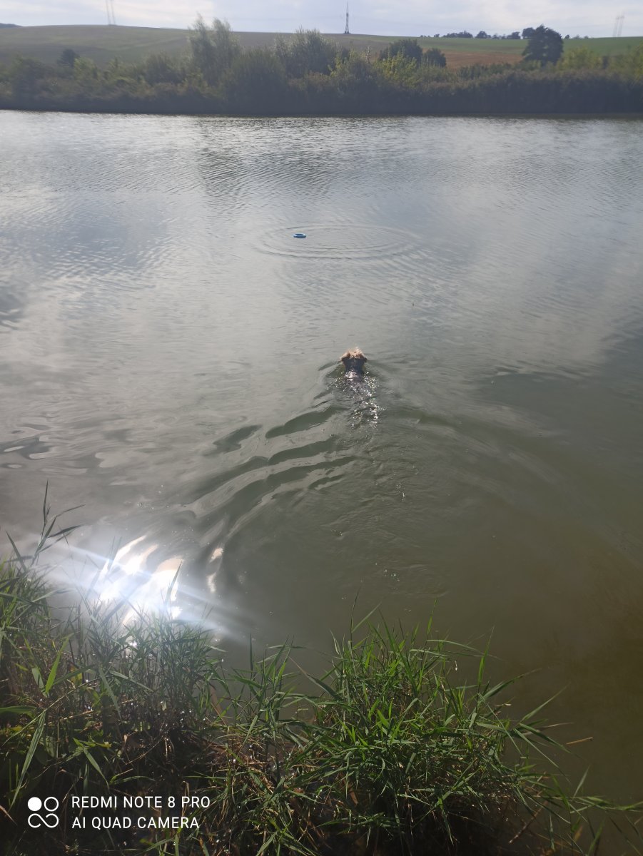 pak s oběma k rybníku zaplavat si a do města do knihovny-tam s nimi chodil venku přítel,než jse vylezla…,Žeryk je dálkoplavec,Dafi se drží u břehu…ale trošku si zaplave….akorát z toho byla hrozně zničená,a do večera ležela zachumlaná v dekách….:-/