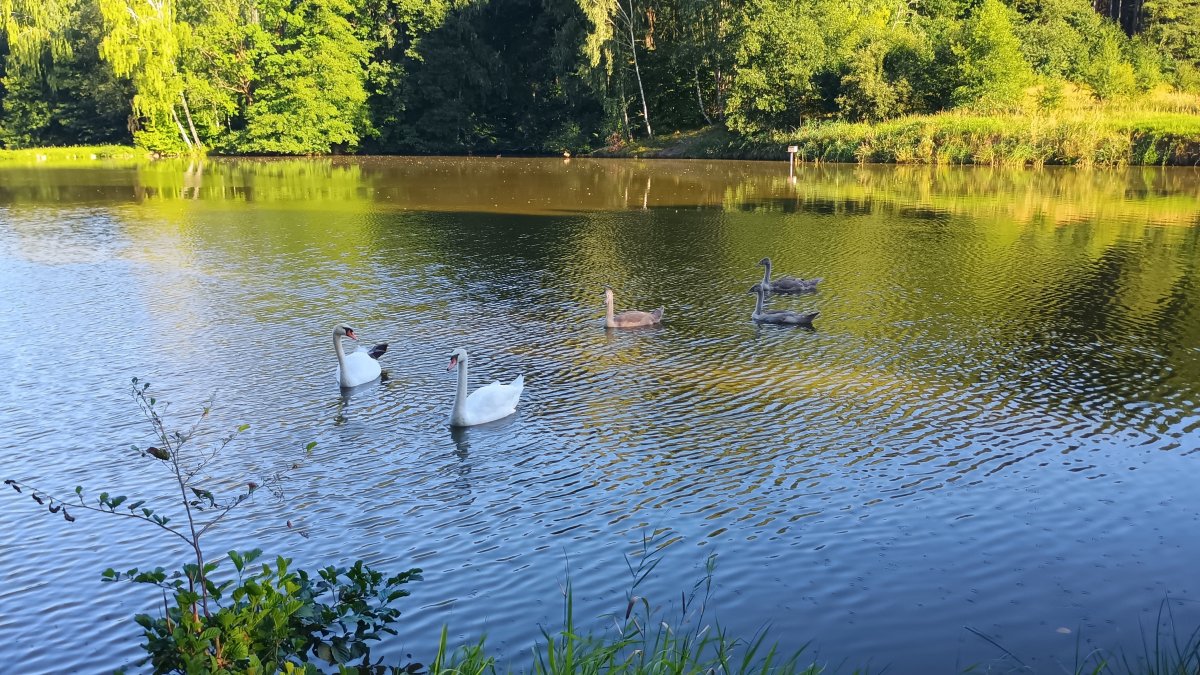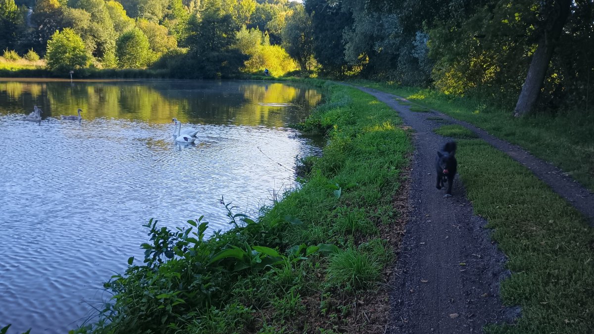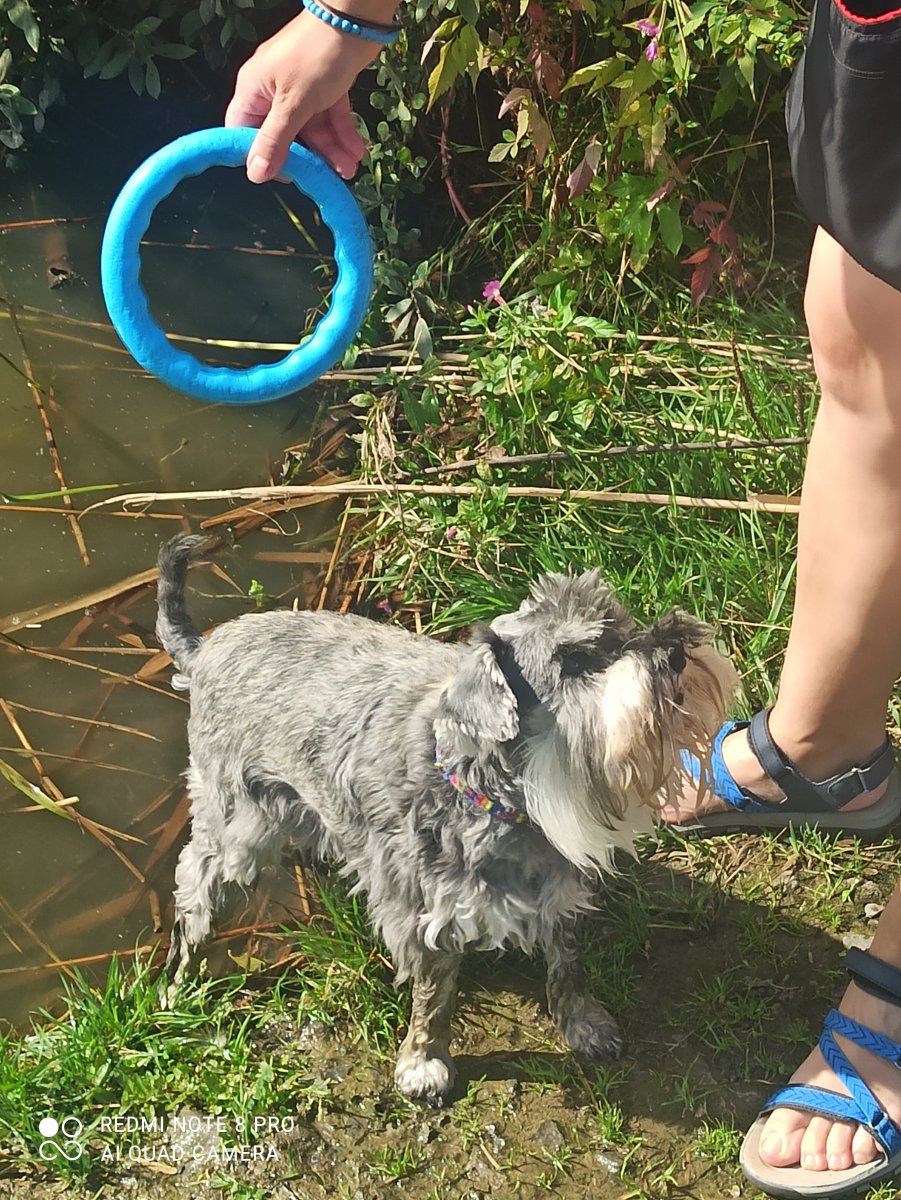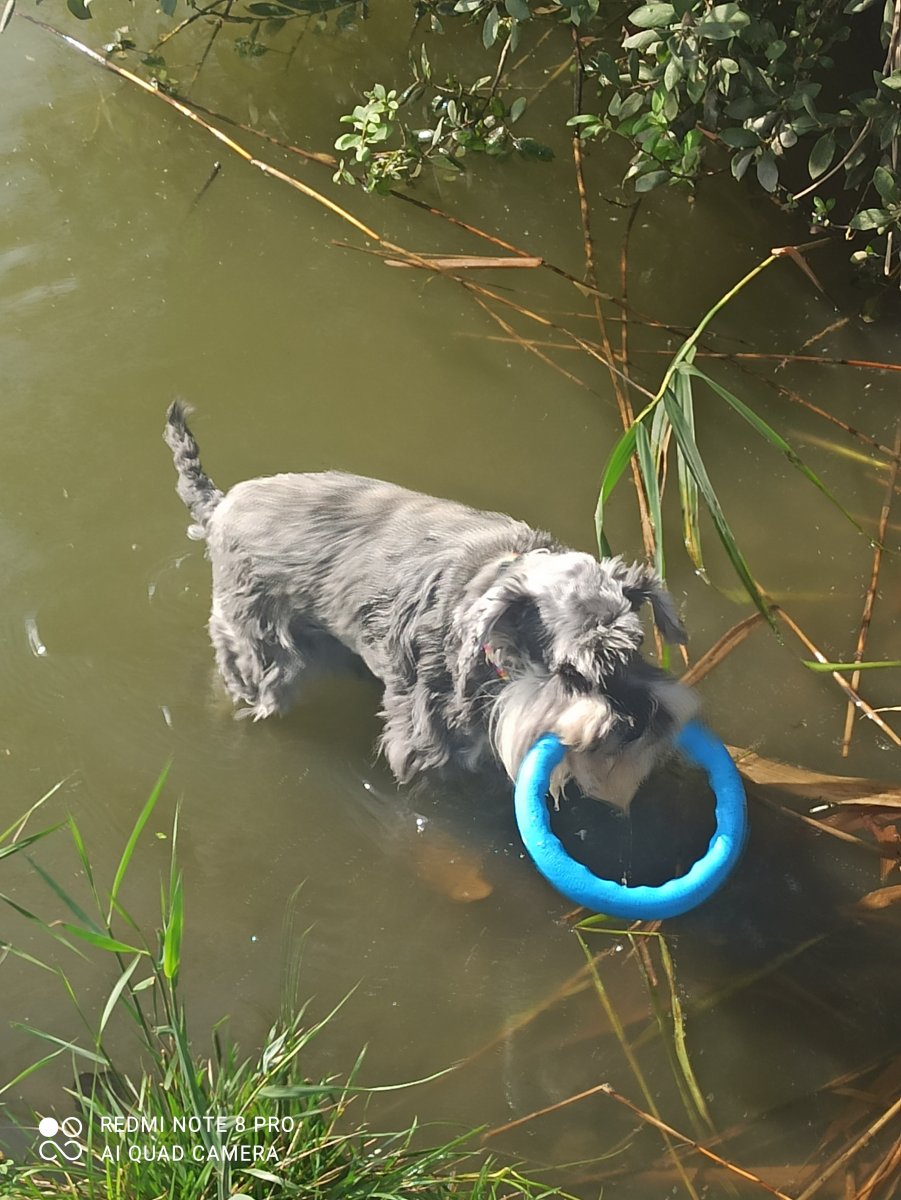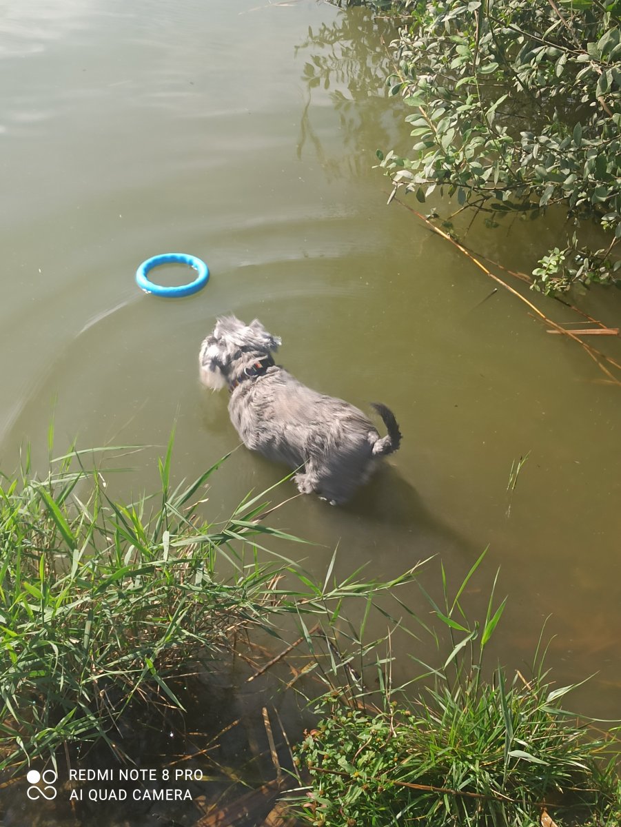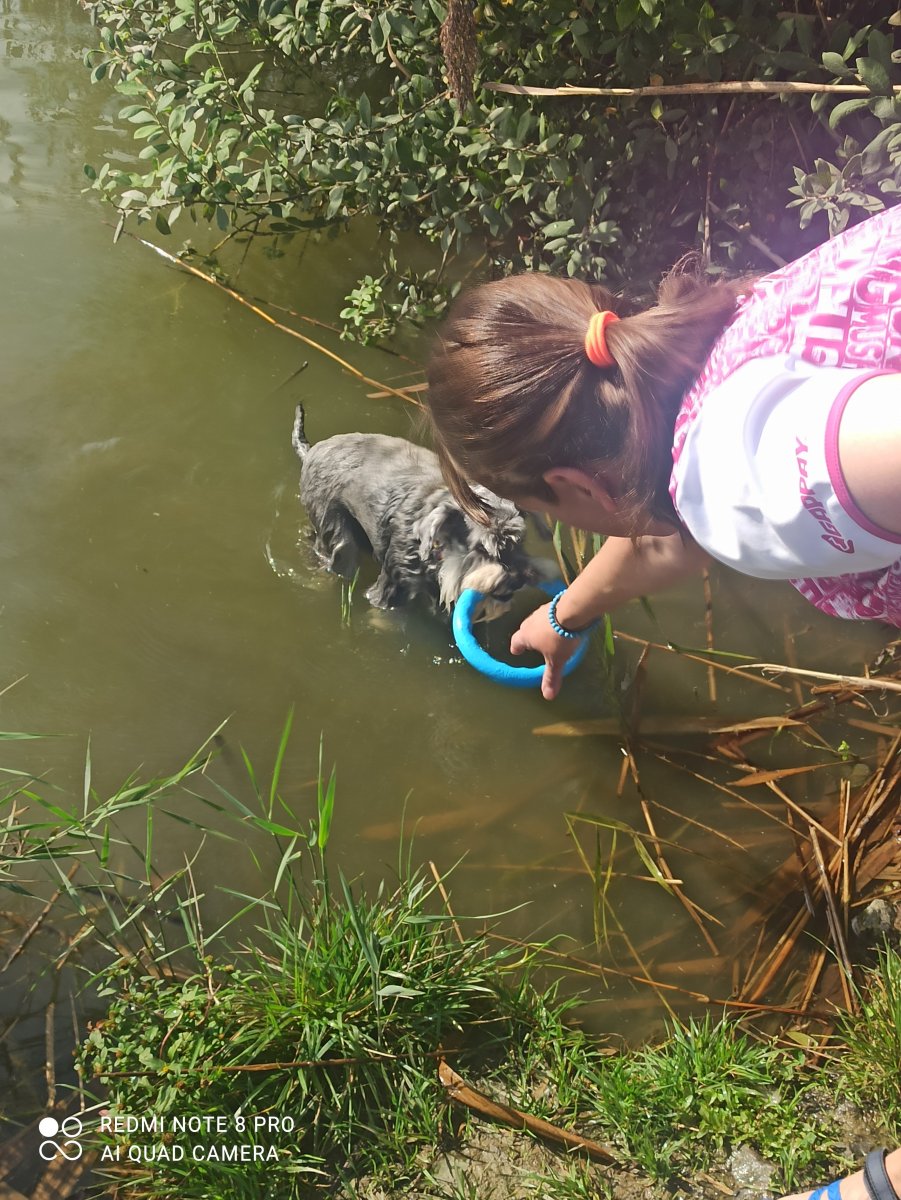 pak s oběma k rybníku zaplavat si a do města do knihovny-tam s nimi chodil venku přítel,než jse vylezla…,Žeryk je dálkoplavec,Dafi se drží u břehu…ale trošku si zaplave….akorát z toho byla hrozně zničená,a do večera ležela zachumlaná v dekách….:-/