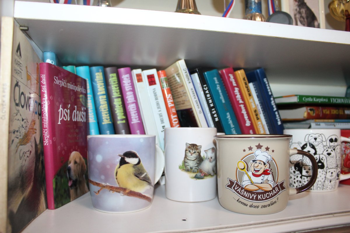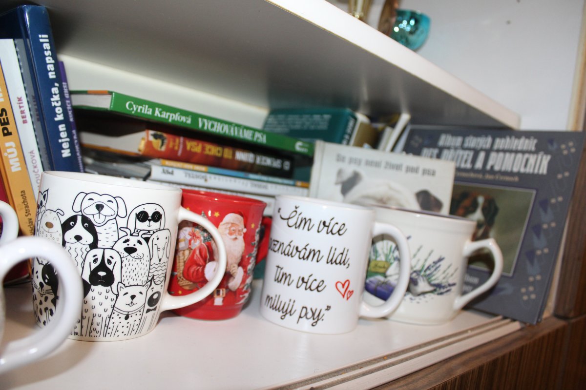a další hrnky-nemám sadu-teda dřív jsem měla sadu toho hrnku vlevo s tou zlatou obrubou-ale zbyly jen 3,pije z nich kafe tatka a kamarádka,ty ostatní všechny pečlivě střídám-menší na menší kafe,větší pak na velký-hrnek s citátem o psech má mna druhé straně knírače,další hrnek s citátem je k Valentýnu,ale koupila jsem si ho sama-Vše co potřebuješ je láska…,pochopitelně sýkorka-který miluju!-2 kotátka mám z Prahy,hrnek z hromadou pejsků je od Plaky-v něm bylo ráno mlíko…😀