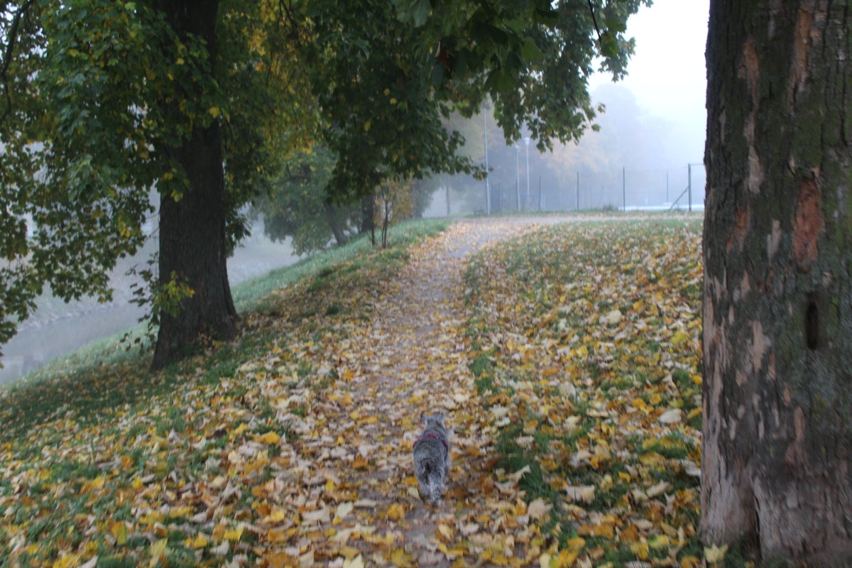 úterý-ranní vycházka v mlze-podél řeky,obíhání stromů,ukázání laviček,Dafi zpět běžela!!heč!!