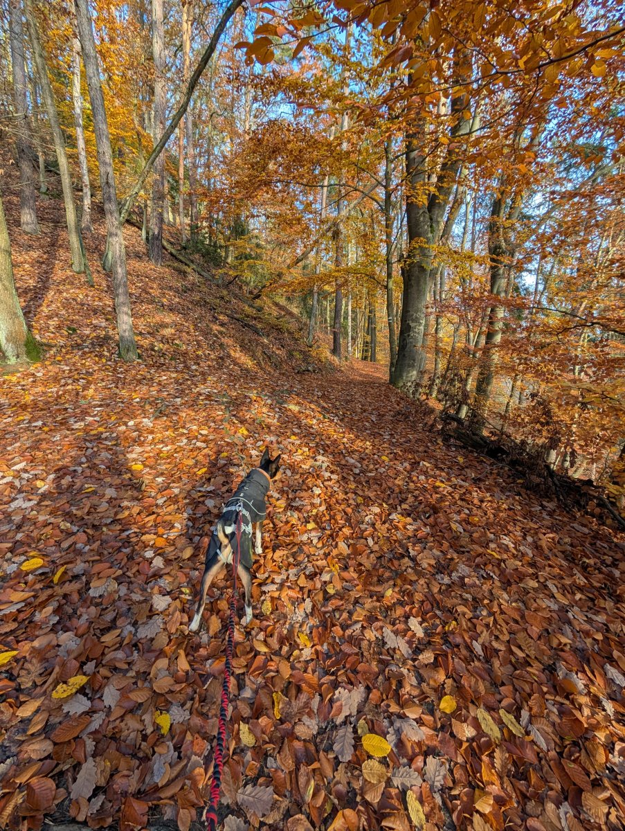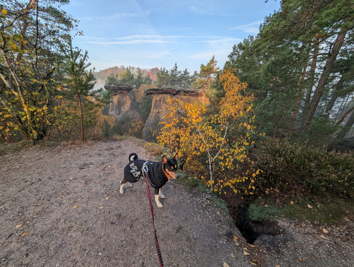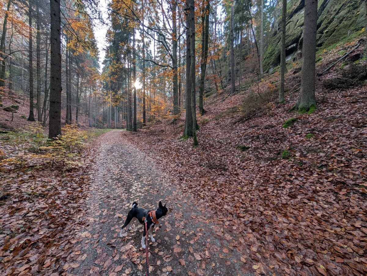 Můj poslední letošní závod se blíží (bude to 33km a něco přes 1000m převýšení), takže potřebuju naběhat kopečky a terén. Znovu jsem vyrazila na Kokořínsko, tentorát trošku upravila trasu a vzala to přes Pokličky. Doufala jsem, že se vyhnu bahnu v roklích, ta trasa je skoro stejná, jen to vede nad tou roklí, kde je tolik bahna. A opravdu mnohem lepší, jen se mě Efík pokusil přizabít při seběhu schodů z Pokliček. Dřevěný schody hodně klouzaly a Efík dost tahal, asi tušil nějakou zvěř...