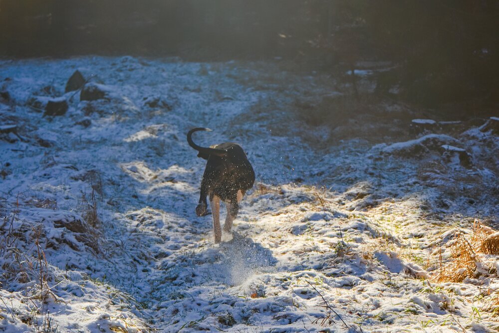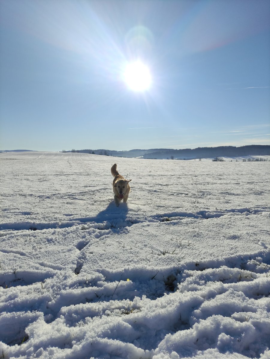 Dnešní procházka po místním lesoparku byla báječná - sluníčko, měkoučký bílý sníh, ne velký provoz - šli jsme přesně v poledne… Jen Yodu chytil skákací a blbnoucí rapl, tak jsem pustila vodítko abychom nebyli zauzlovaní a to jsem neměla dělat - rázem trýýýýskal a smykoval a válel se ve sněhu, až jsem mu nadávala, že určitě zase bude večer odlehčovat levou zadní. No a na zahradě (na sluníčku už sníh mizí) po vypuštění z vodítka řádění zopakoval - sníh i mokré drny pod ním lítaly na všechny strany - ale zakázat mu to nemá cenu - prostě radost z pohybu