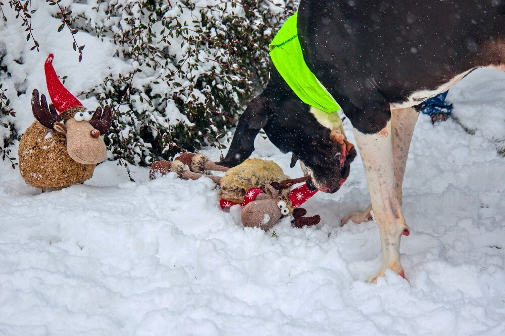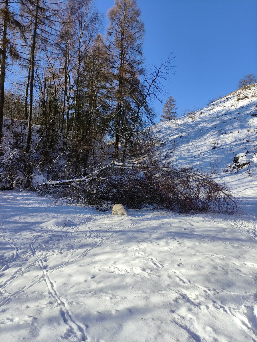 tak tedy nejprve Yoda tento týden - od půlky týdne venčíme jen kolem vrátek - velký pluh to z kopce nedobrzdil a zatímco z jeho radlice ani neopadal nalepený sníh, tak chudák naše autíčko nemá levý blatník. Holt stalo se, hlavně že se nic krom pomačkaných plechů nestalo. Yodovi je ale jedno, kde ve sněhu řádí… Jo a na jedné fotce mi ničí přípravu na novoročenky. Doma mu adventní sobíci vůbec nevadí, venku je lovil 😄