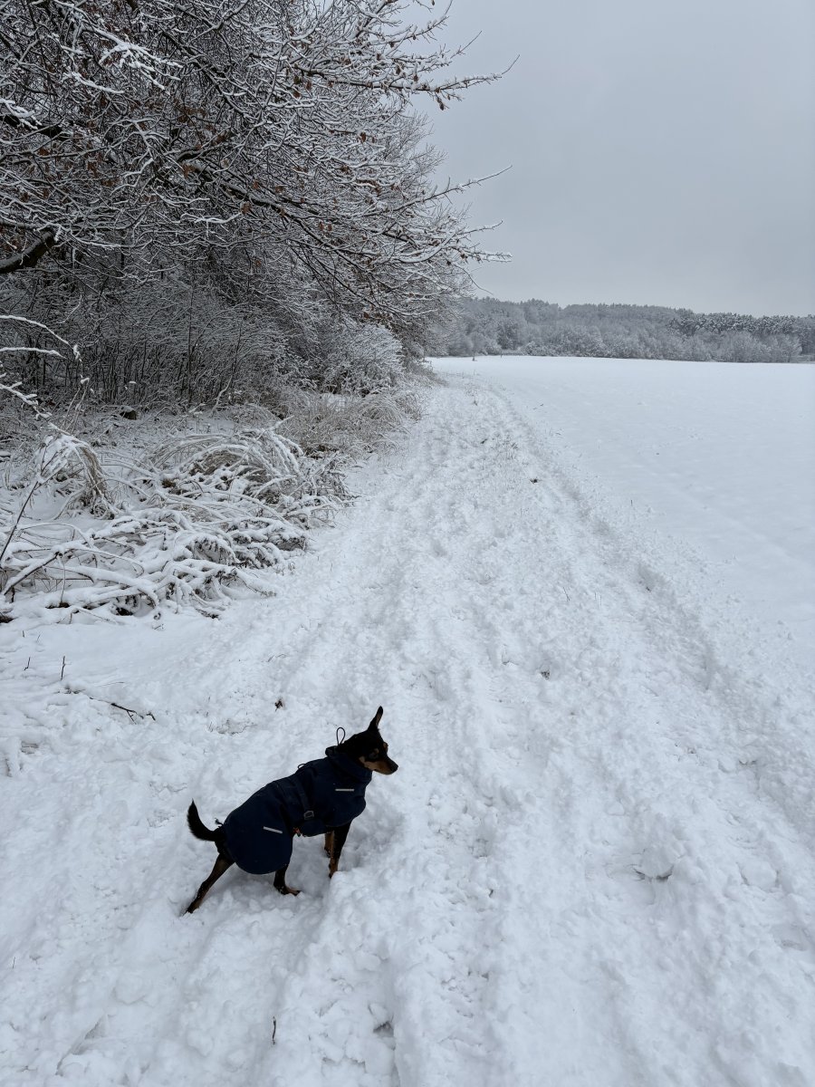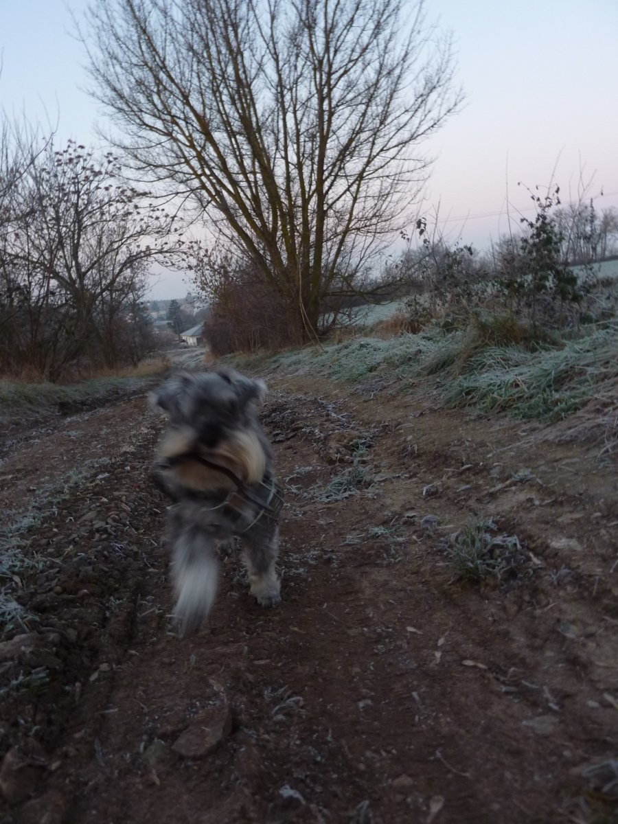 dnes extra s Dafi kousek k lípě,aporty náhubku a činky-mrzlo,mínus 6-bundu nemá schválně,protože nepřetržitě běhala-šla jsem zahradou,hned bez vodítka,za zahradou hned pole,cesta k lípě,takže furt běhala a mě se zdá,že je v té bundě jak robot…