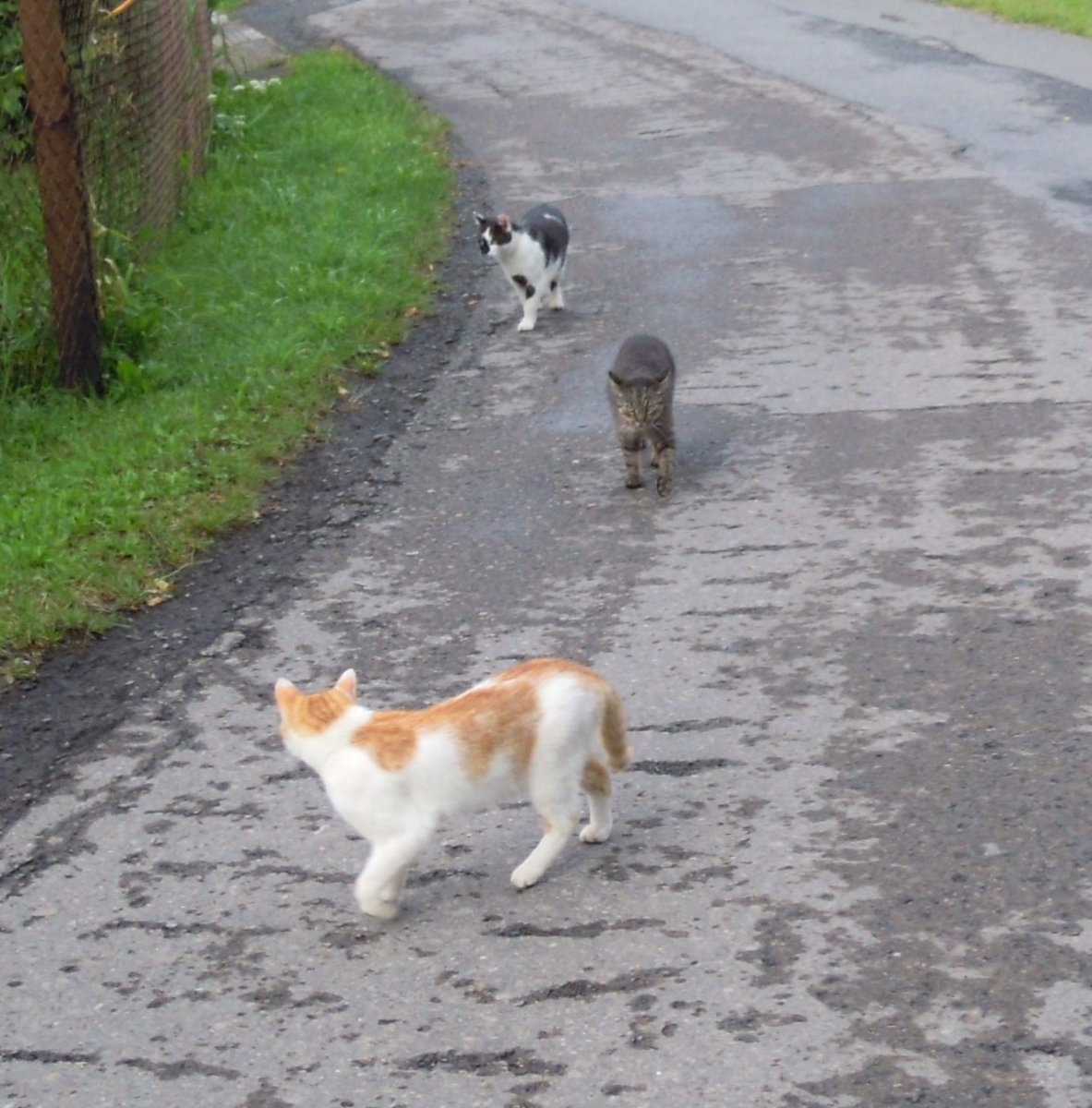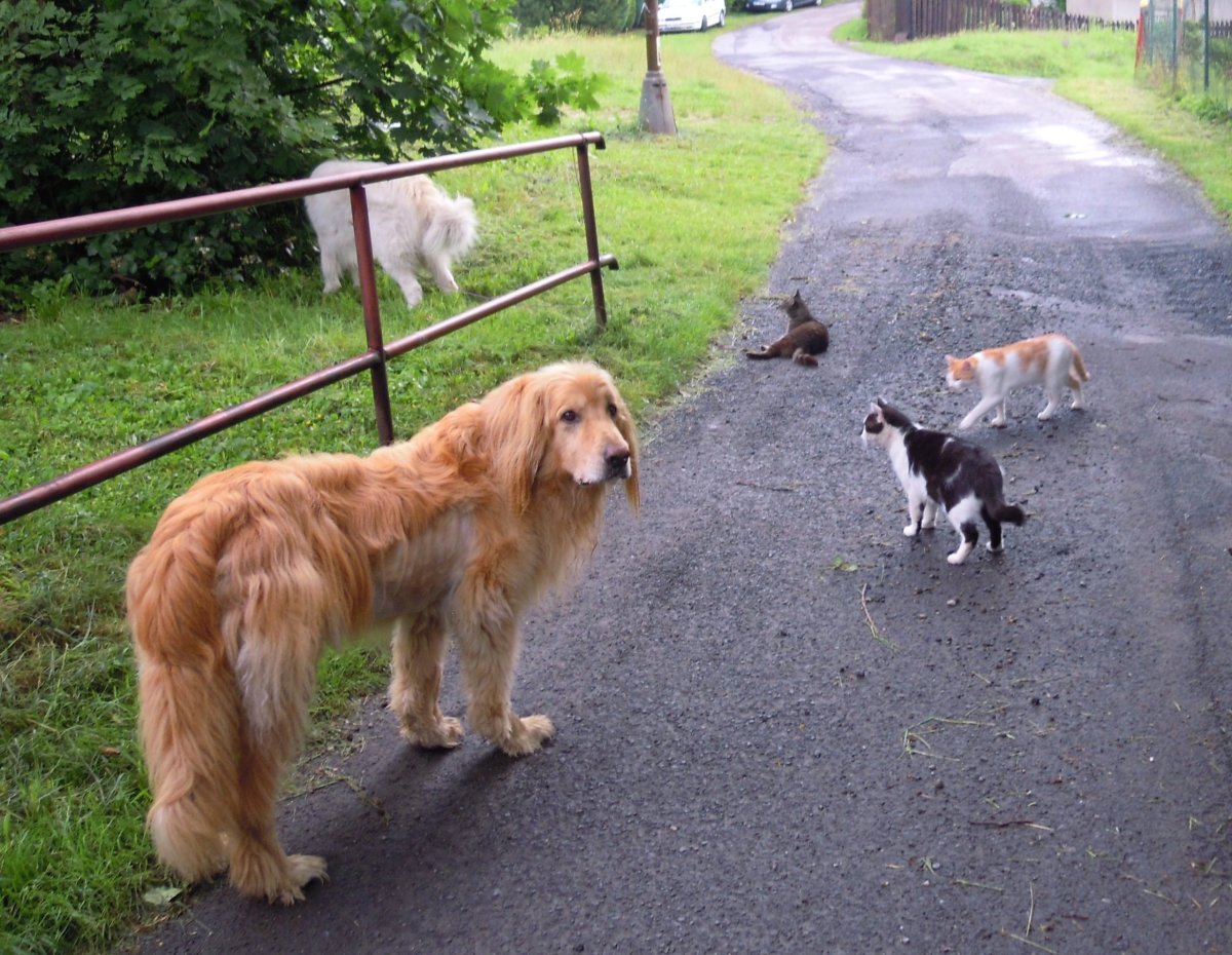 S námi chodí černý kocour, ale jen když nejdeme k hlavní silnici.Bojí se aut a k silnici se nepřibližuje.V létě mně posílala fotku kamarádka.Ta chodí se dvěma berňačkami a třemi kočkami.A jako naschvál ji nemůžu nalézt. Jo u nás je jediný šplhavec Emil.Takže když člověk něco dělá venku,tak buď se mu plete pod nohy nebo mu vyšplhá za krk,ale to já se neohýbám.Jen ať se snaží, když tam musí být,ale nejhorší je, když na mě skočí někde ze střechy králíkárny.
