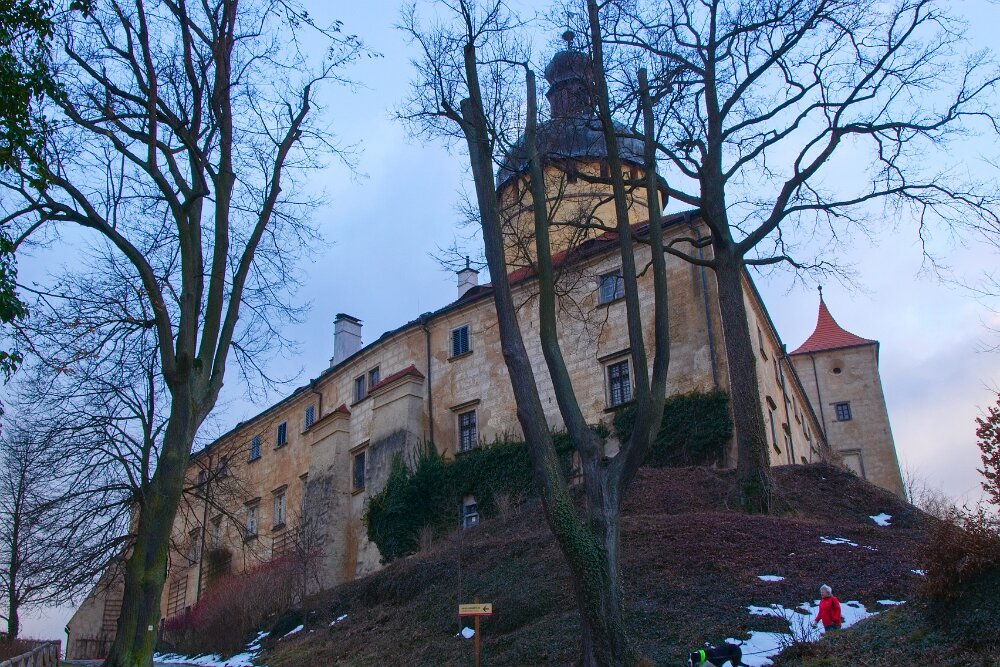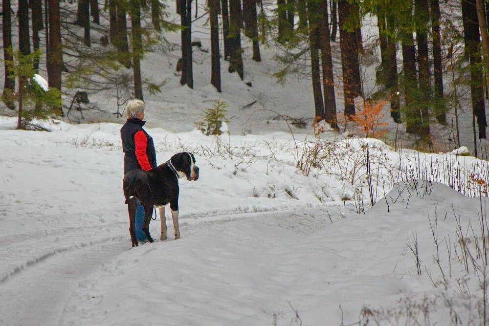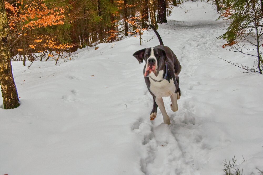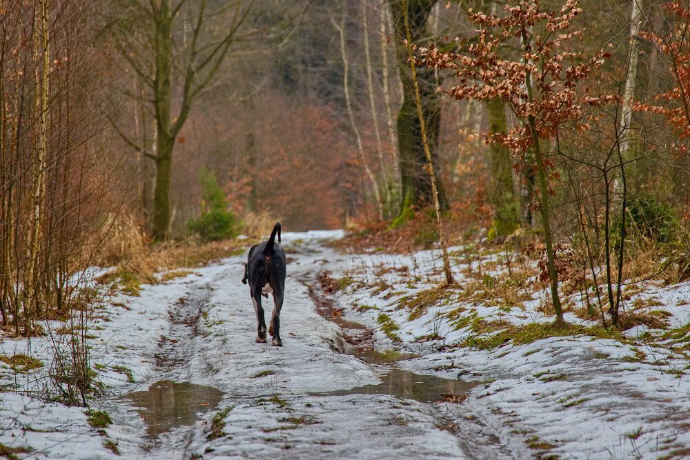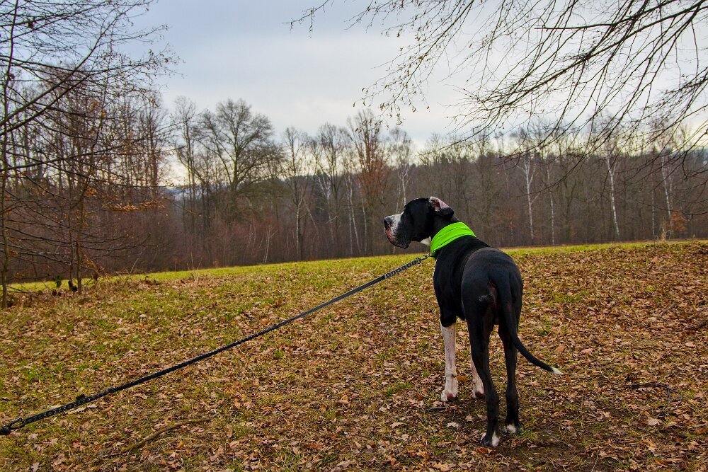 Yoda mě dneska nejprve dělal radost - v civilizaci kolem hradu chodil perfektně, pak ustál hezky setkání s kopytníky, v pohodě v lese šel na volno a reagoval na každý pokyn… a pak mě vytočil, jako už dlouho ne - dvakrát po sobě vyrazil za pohybem (auta daleko maličká na obzoru prosvítající mezi stromy). To už neudělal hodně dlouho. Sice to vždy na zařvání otočil - ani zdaleka se k silnici nepřiblížil… auto ho ani nemohlo zaregistrovat… ale stejně bych ho zabila. Hlavně jsem to nečekala a málem mi vyrval ruku z pantu. Takže pak měl “galeje”… střídali jsme chůzi u nohy s povelem stůj… Návrat do věku štěněcího. Jinak procházka z Grabštejna k “80 dubům” byla parádní - sněhu minimum (proto jsme tam jeli - u nás to je v lese ještě na delší chůzi blbý), vítr snesitelný a kromě srnek jsme nepotkali ani živáčka.